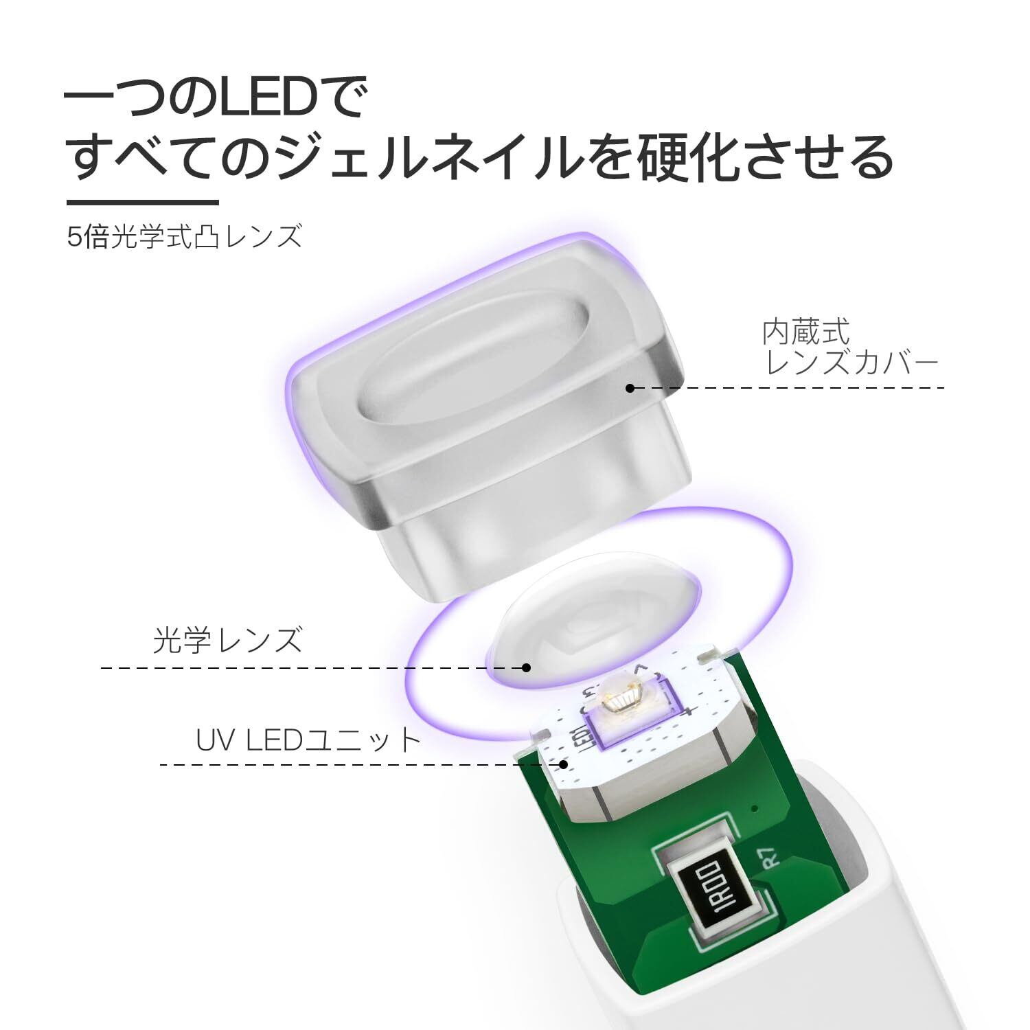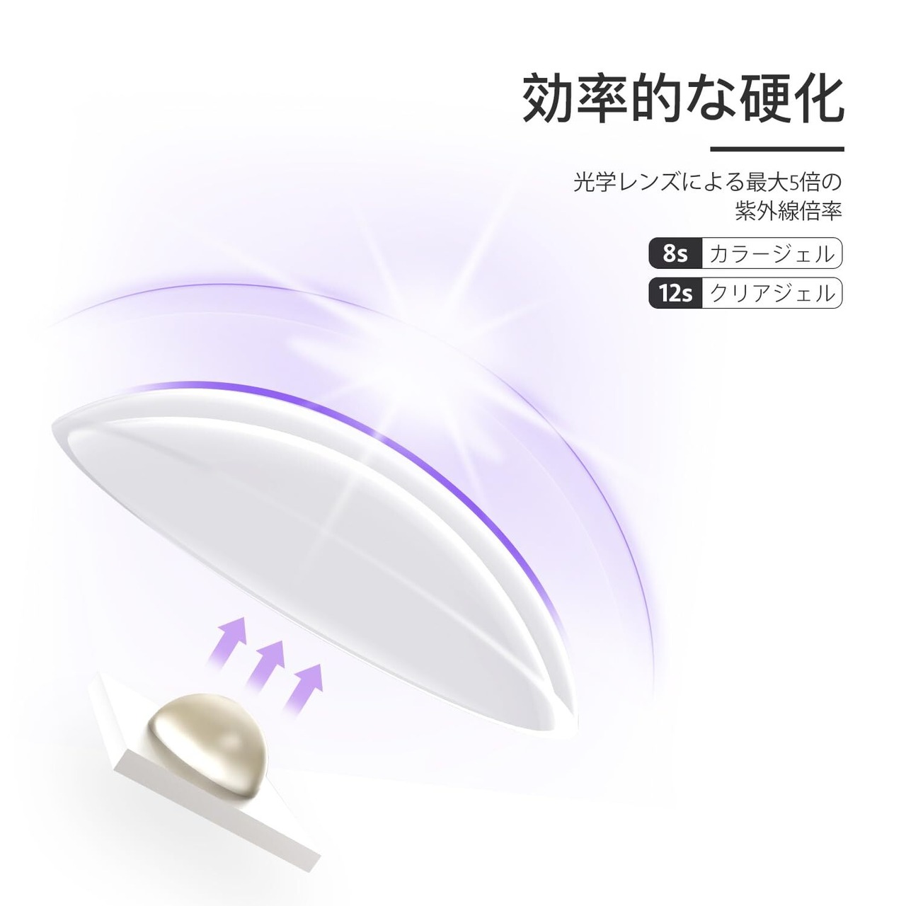 速乾性・強力:5倍凸レンズと3Wのハイパワーライトを採用し、短時間で素早く均一に仮硬化できます。ベース・カラージェルは8秒で硬化し、トップジェルは12秒で硬化します。