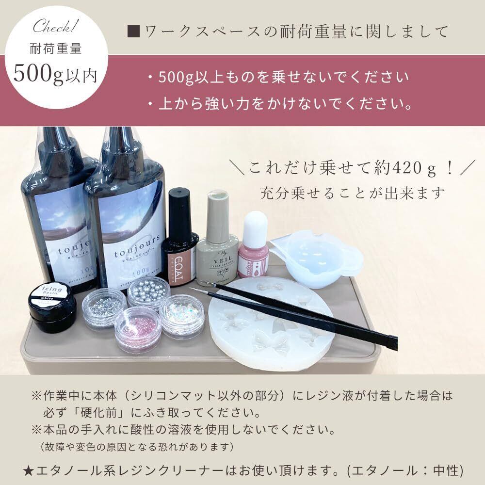 耐荷重は約500gです。それ以上の重量のものを乗せたり上から強い力をかけたりしないで下さい。破損の原因となります。ジェルネイルでライトを直接手に当ててご使用のする際、熱さなど 異常を感じたら使用を中止してください。やけど、皮膚に炎症を起こす恐れがあります。連続点灯機能は安全のため15分で自動消灯しますが、長くお使いいただくために8分を超えないようにしてください。※その他、付属の取り扱い説明書をご使用前にご一読いただきますようお願い申し上げます。