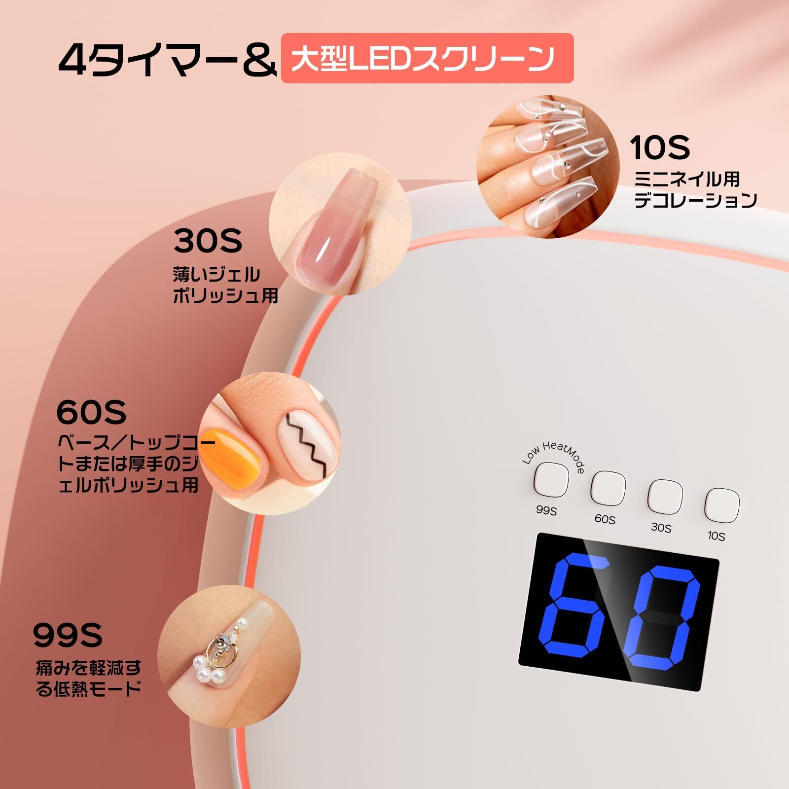 ■【時間短縮を実現する速乾性!】60Wの高出力で、短時間で効率的に硬化が完了します。ジェルネイルポリッシュも数分で硬化するため、忙しい方にぴったりのアイテムです。ネイルアートの手間を大幅に削減し、スムーズに施術を進めることができます。