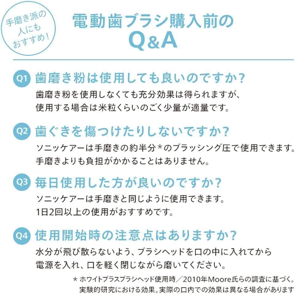 イージースタート機能搭載でフィリップス ソニッケアーでの歯磨きに徐々に慣れていただけるよう、使いはじめから 14 回目にかけて徐々にパワーを上げていく電動歯ブラシ初心者に対応。 毎分約31,000ストロークの高速振動で歯垢をたたき浮かせ、ブラシヘッドの幅広い振幅で浮かせた歯垢をはらい落とすと同時に、それらの動きが口の中の唾液の流れ「音波水流」を発生させ、やさしく、効果的に歯垢をかき出すサポートをします。