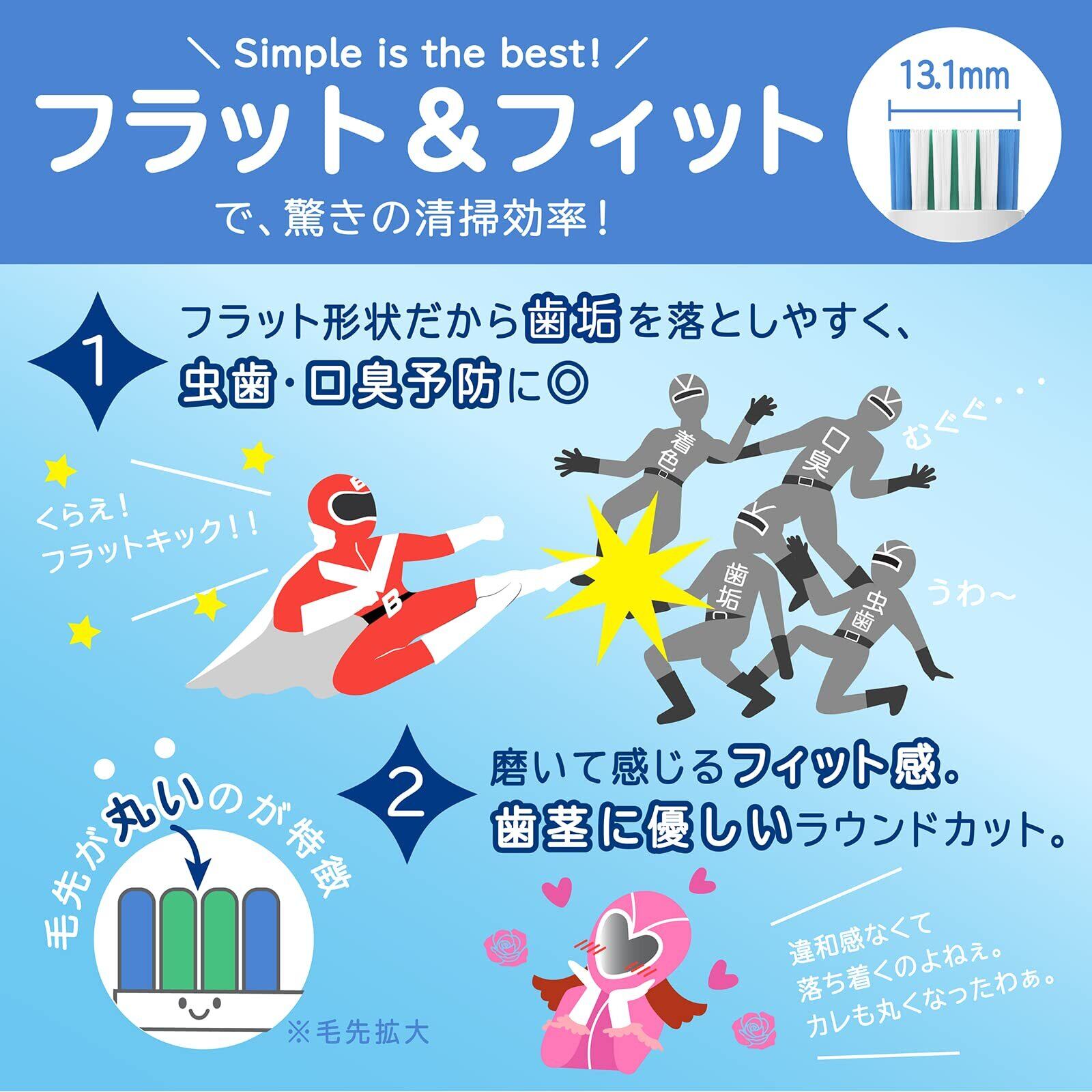 ブラシの形状:フラットタイプなので、歯に均等に圧力をかけられるため、歯の表面の歯垢を落としやすいのが特徴です。手磨き用歯ブラシでも定番の形状なので、電動歯ブラシが初めての方でも違和感なくご使用いただけます。