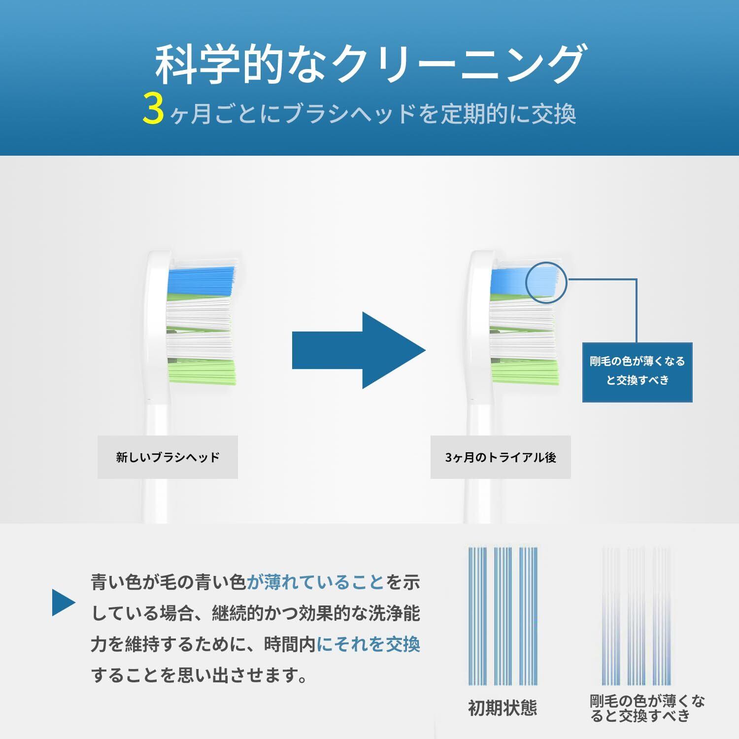 交換リマインダー:交換のタイミングがくると、ブルー毛が色褪せて白になって、貴方に交換を知らせます。3ヶ月以内に歯ブラシのヘッドを交換することをお勧めしています。 常にブラシヘッドを健康で効果的に機能できるようにしてください。