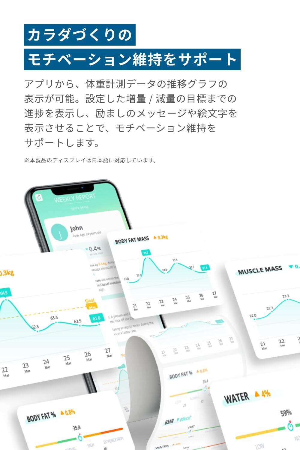 ■【多機能で便利!】この体重計は、体重だけでなく、BMI、体脂肪率、基礎代謝量、水分量、骨量、内臓脂肪など、詳しい体のデータを測定。健康状態を全方位から把握することができ、確実な健康管理が可能です。