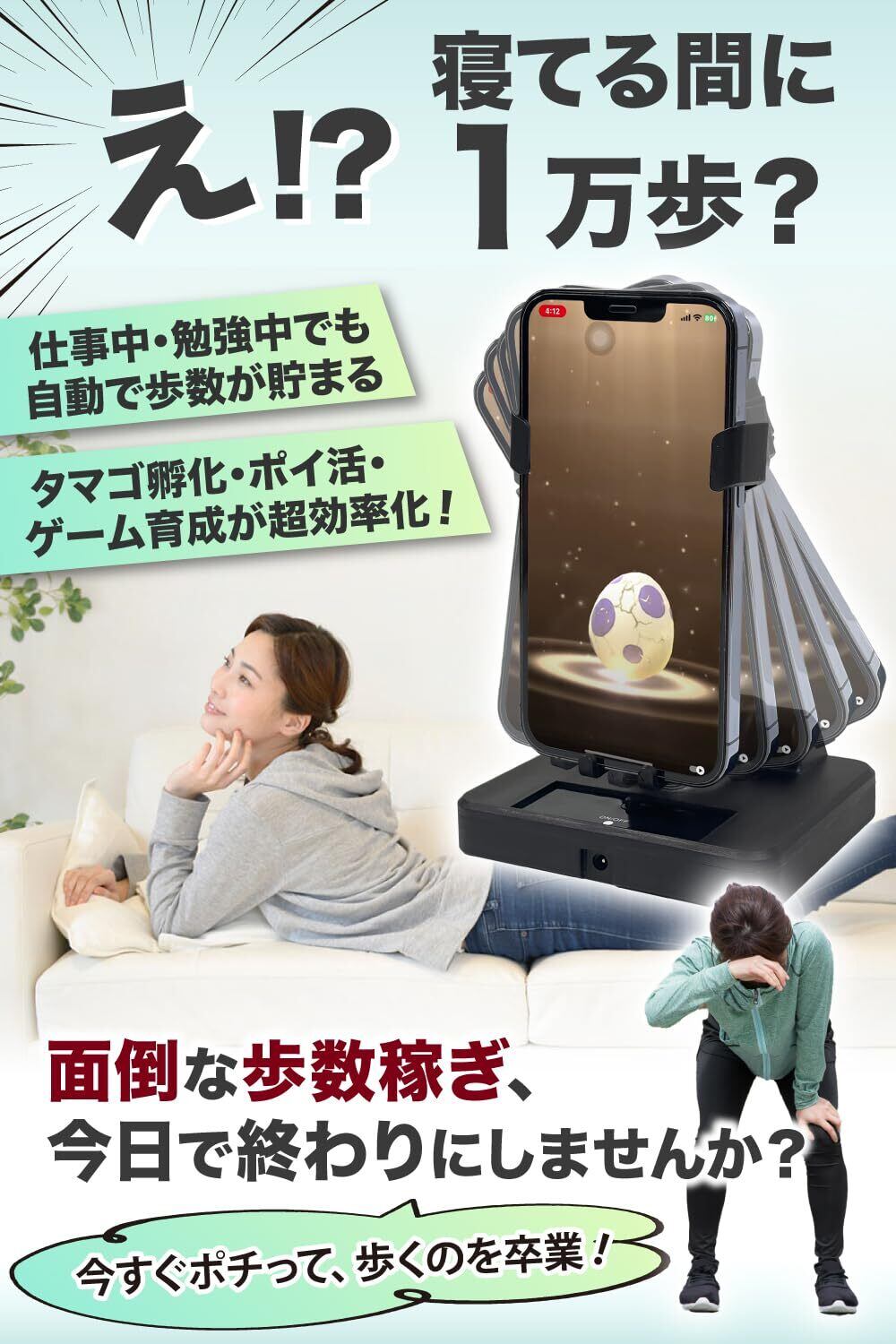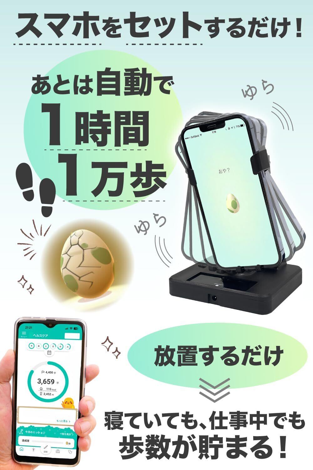 ■【ダイナミックな振り子機構!】独自の振り子機構によって、スマホをセットするだけで、まるで実際に動いているかのように歩数をカウントします。デスクワークや運動不足を解消し、楽しく健康を意識した生活を提案します。