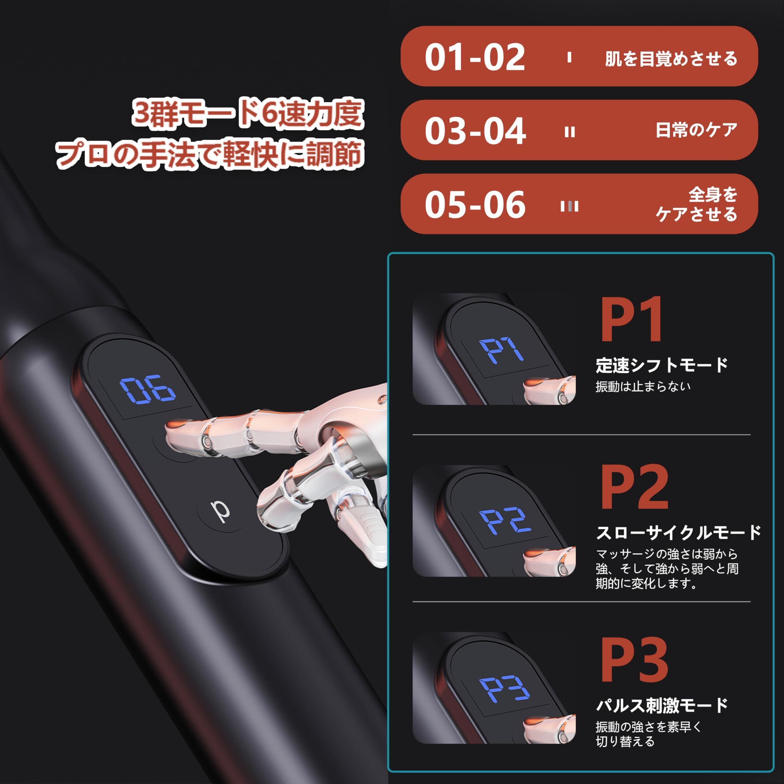 【3種類のモード&6段階の振動レベル】:この筋膜リリースガンには3種類のモードと6段階の振動レベルがあり、電源ボタンを軽く押すだけで、筋肉に接触する強さに合わせて振動周波数を調整できます。身体の部位に応じて細かく調節できると同時に、自分に合った好みの振動レベルとモードを簡単に見つけることができ、快適性が向上します!15分間のタイマー機能を備えており、長時間無意識に使用することで生じる繰り返し使用のリスクを防止できます。