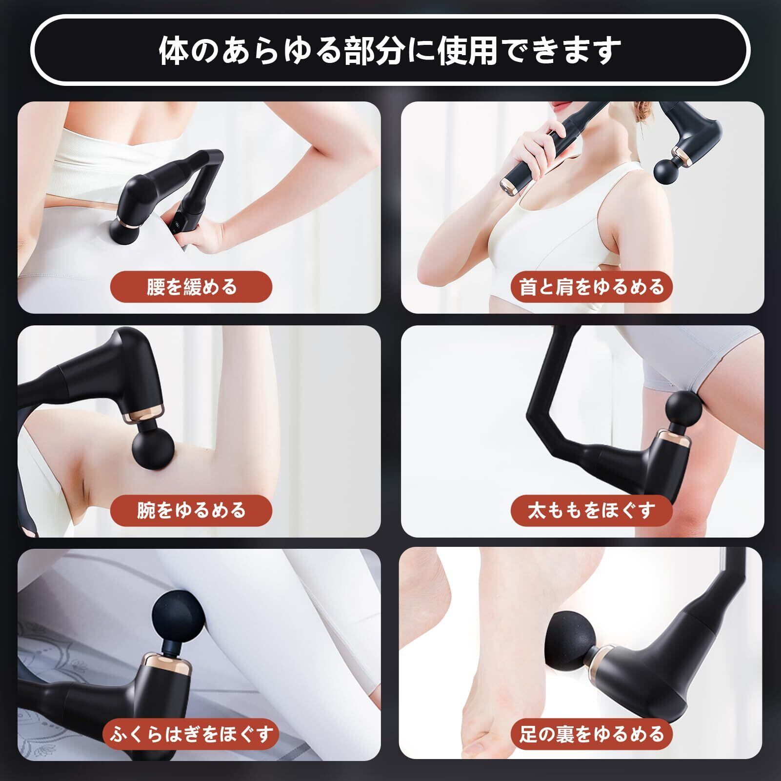 ■【4種類の専用ヘッドで全身対応!】付属の4つのアタッチメントは、肩、背中、腰、足など、さまざまな部位にしっかりとフィット。各部位に最適なケアが可能で、疲れや痛みを効率的に緩和します。