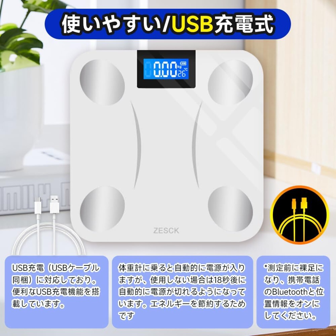 【USB充電式&自動電源オン/オフ機能】便利なUSB充電式で、ケーブルも同梱。乗るだけで自動的に電源が入り、使用後は約18秒で自動オフ。エネルギー効率にも配慮されています。※正確な測定のため、素足で乗り、Bluetoothと位置情報を有効にしてください。