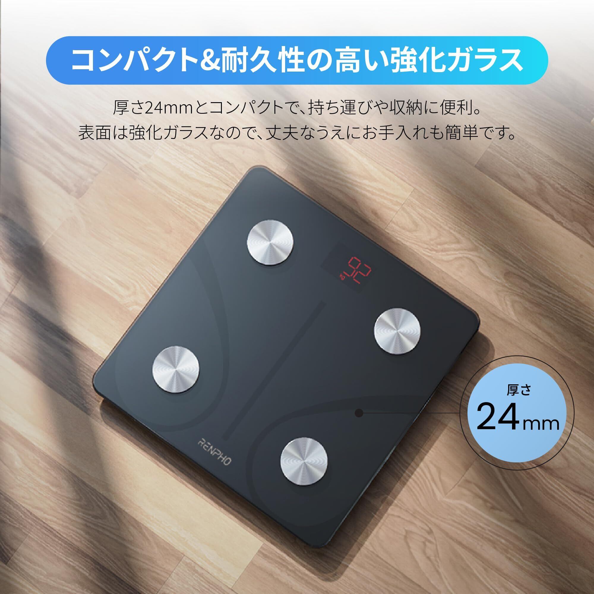 RENPHO Elis 1 スマート体組成計 ブラック 体重計 レンフォ 第二世代 Bluetooth接続 13項目測定可能 高精度 体脂肪計 強化ガラストップ 自動電源ON/OFF 日本語アプリ Renpho Health 健康管理 スマホ連動 登録人数無制限 体組成計 日本語取扱説明書 スリム 収納 データ管理 BIA技術 強化ガラス ES-CS20M