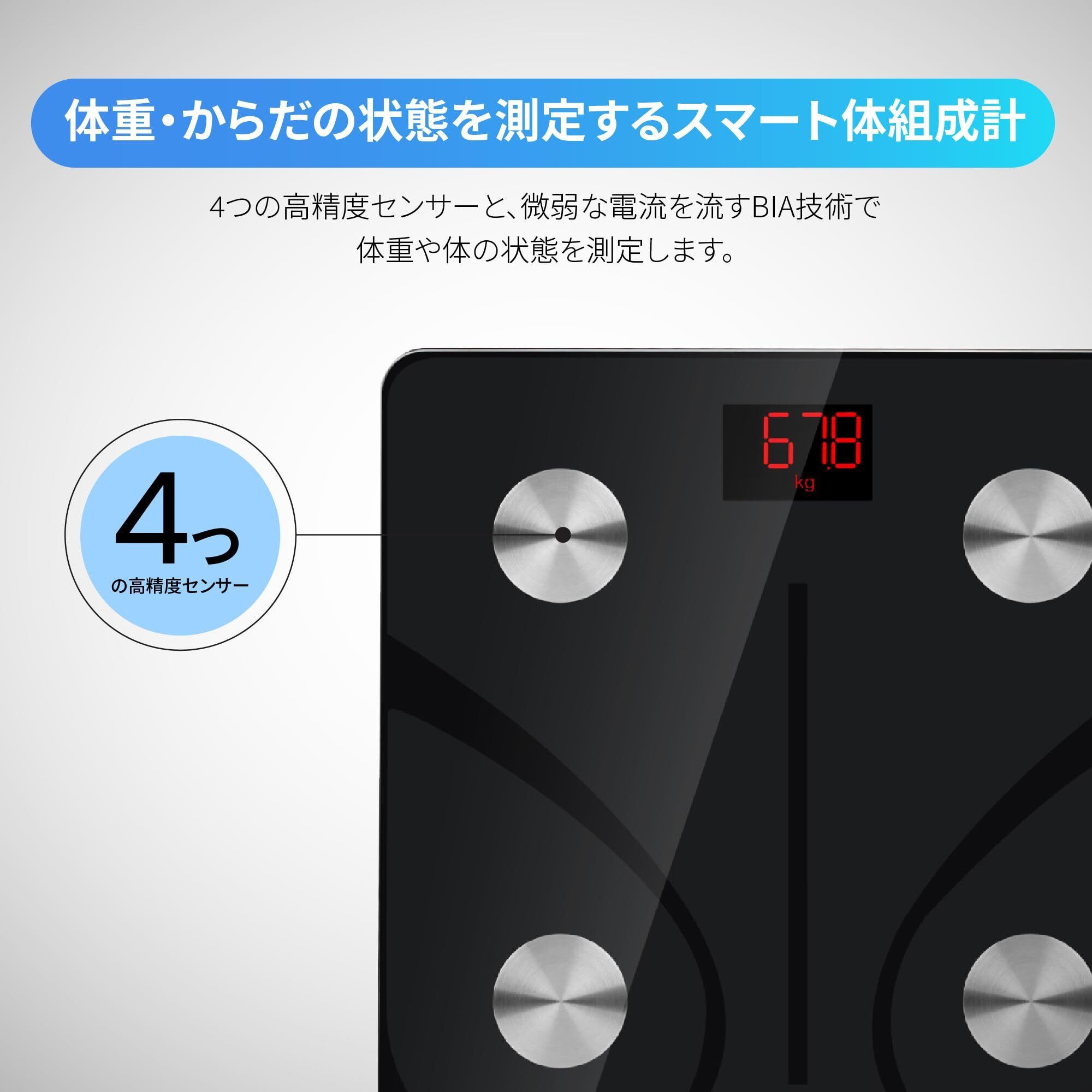 【体重とからだの状態を測定】4つの高精度センサーを搭載したスマート体組成計です。体重はもちろん、体に微弱な電流を流すBIA技術で、体調管理に重要な13種類の項目を測定します。計測単位は、Stone、kg、Ib、st:Ibの4つのからお選びいただけます。