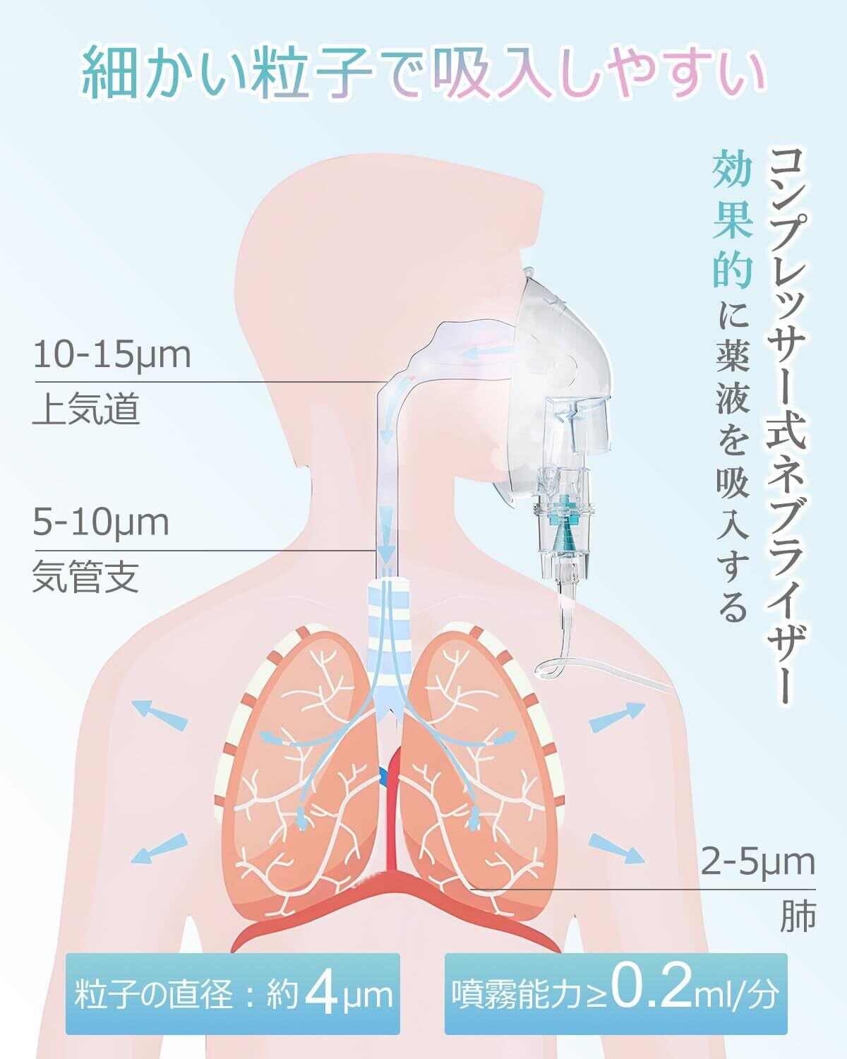 5V1Aのアダプタを使用する場合は、吸入器に十分な動力を提供できないので噴霧できない恐れがあります。5V2Aのアダプタを使用してみてください。【細かい粒子で吸入しやすい】は薬液を4μm以下の細かい霧状のスチーム状にします。自然に呼吸をしているだけで気管支や肺の粘膜に、直接に薬液の有効成分が届きます。吸入薬は経口薬よりも少ない量で大きな効果があります。噴霧粒子径:約MMD4μm 噴霧能力≥0.2ml/分