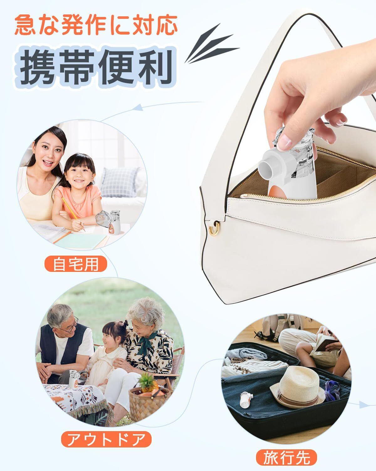 【静音・軽量・コンパクト】従来のコンプレッサー式ネブライザに比べ動作音が静かな静音設計です。動作ノイズが50dBA未満で、外出先や夜中でも気にすることなく吸入できます。また、本体の重さは軽量です。手のひらサイズで場所を取らず、小さな子供でも握りやすく、持ち運びにも便利です。
