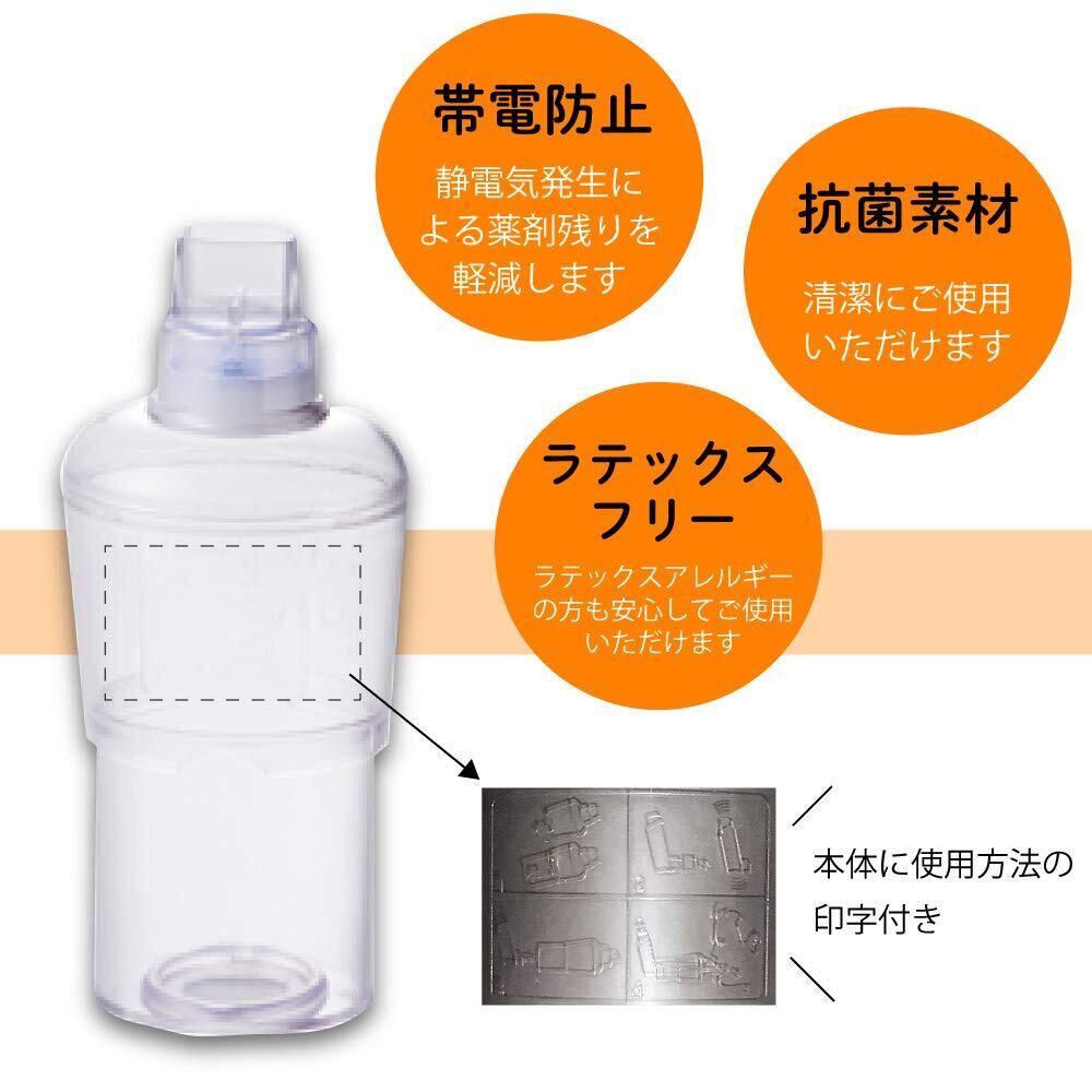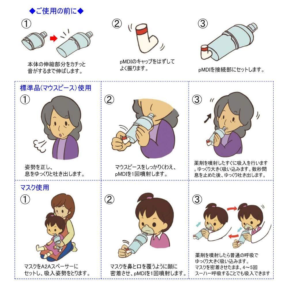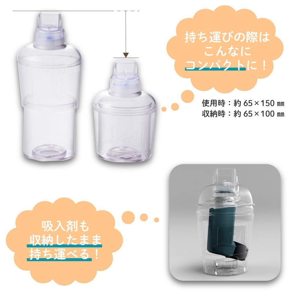 pMDI(定量噴霧式吸入器)を吸入するための補助器具です。pMDIとの接合部分は柔らかいゴムでできており、各種pMDIに使用可能です。本体が伸縮し、内部にpMDIを収納可能なので、持ち運びや保管に便利です。本体に使用手順のイラストが表記されているので、初めての方でも安心です。抗菌・帯電防止素材を使用。ラテックスフリー。