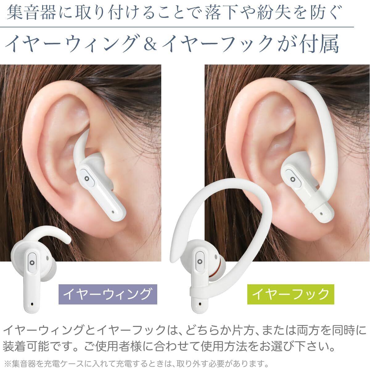 【落下や紛失を防ぐイヤーウィング&イヤーフック付属】不意な落下による集音器の紛失や故障を予防するイヤーウィングとイヤーフックが付属します。イヤーウィングとイヤーフックは、どちらか片方、または両方を同時に装着可能です。ご使用者様に合わせて使用方法をお選び下さい。