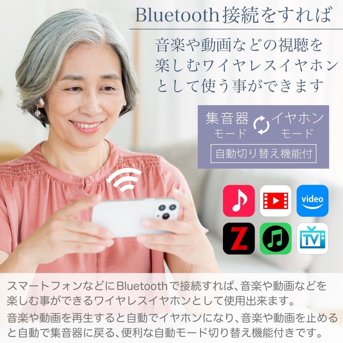 【ワイヤレスイヤホンとして使うこともできます】スマートフォンなどにBluetoothで接続すれば、音楽や動画などを楽しむ事ができるワイヤレスイヤホンとして使用出来ます。音楽や動画を再生すると自動でイヤホンになり、音楽や動画を止めると自動で集音器に戻る、便利な自動モード切り替え機能付きです。
