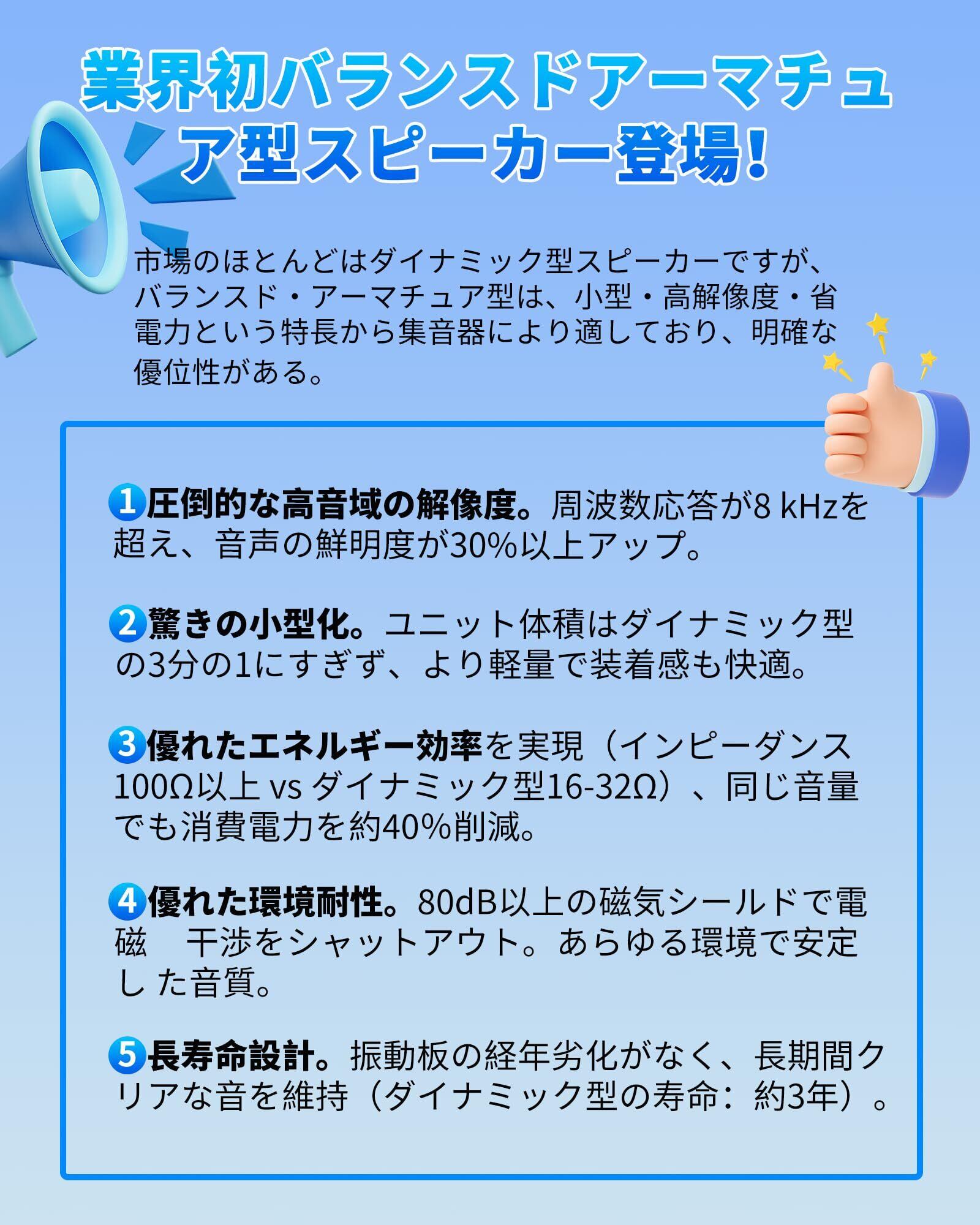 【業界初バランスドアーマチュア型スピーカー登場!】市場のほとんどはダイナミック型スピーカーですが、バランスド・アーマチュア型は、小型・高解像度・省電力という特長から集音器により適しており、明確な優位性がある。➊圧倒的な高音域の解像度。周波数応答が8 kHzを超え、音声の鮮明度が30%以上アップ。➋驚きの小型化。ユニット体積はダイナミック型の3分の1にすぎず、より軽量で装着感も快適。➌優れたエネルギー効率を実現(インピーダンス100Ω以上 vs ダイナミック型16-32Ω)、同じ音量でも消費電力を約40%削減。➍優れた環境耐性。80dB以上の磁気シールドで電磁干渉をシャットアウト。あらゆる環境で安定した音質。➎長寿命設計。振動板の経年劣化がなく、長期間クリアな音を維持(ダイナミック型の寿命:約3年)。