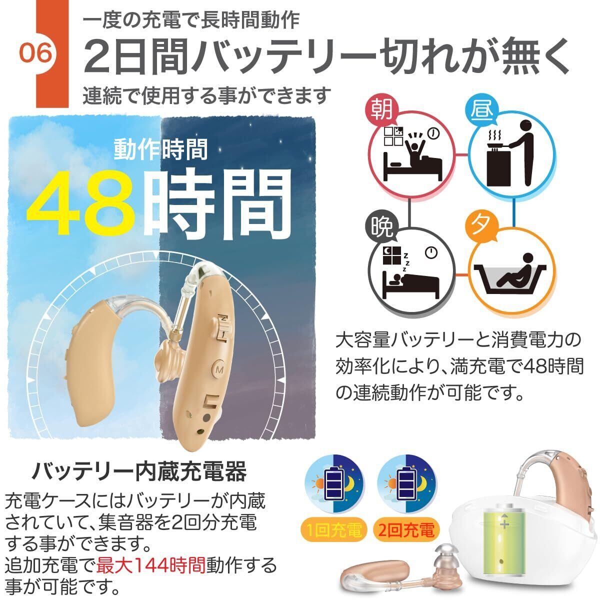 「長時間動作」 一度の充電で長時間動作2日間バッテリー切れが無く連続で使用する事ができます。バッテリー内蔵の充電器なので集音器を2回分充電する事ができます。