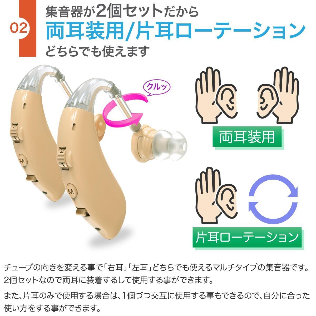 「集音器が2個セットだから両耳装用 / 片耳 ローテーションどちらでも使えます」 チューブの向きを変える事で「右耳」「左耳」どちらでも使えるマルチタイプの集音器です。2個セットなので両耳に装着して使用する事ができます。また、片耳のみで使用する場合は、1個づつ交互に使用する事ができるので、自分に合った使い方を選ぶ事ができます。