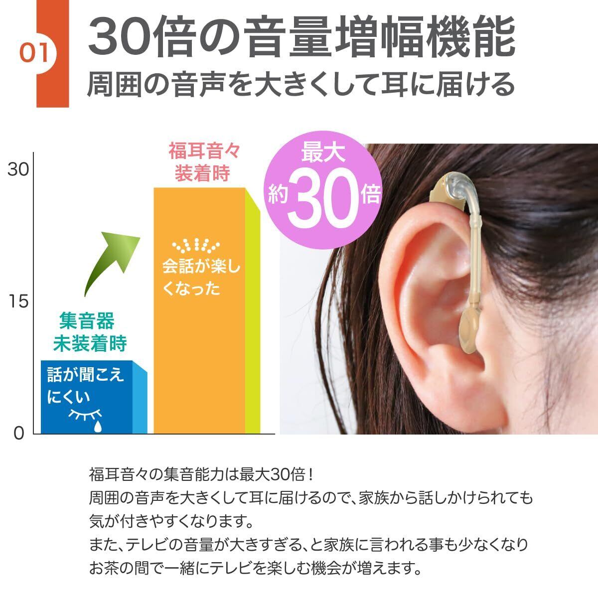 「周囲の音を30倍に大きくしてくれる集音器」 福耳音々は、周囲の音を最大約30倍に増幅して聞くことができる、耳かけ型の集音器です。