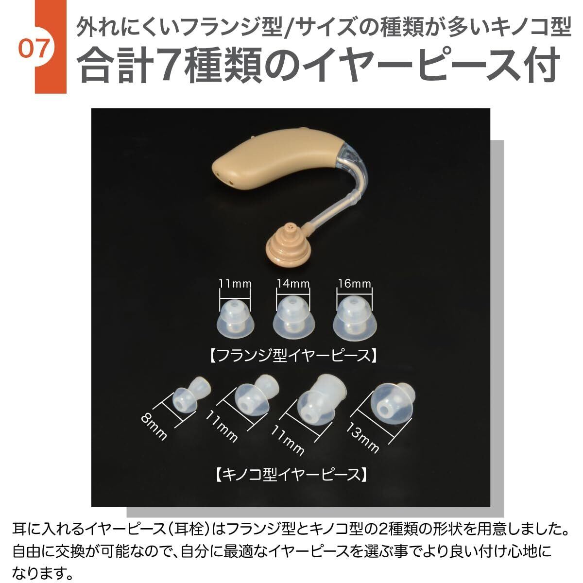 「合計7種類のイヤーピース付」 外れにくいフランジ型、サイズの種類が多いキノコ型の合計7種類のイヤーピースが付属します。