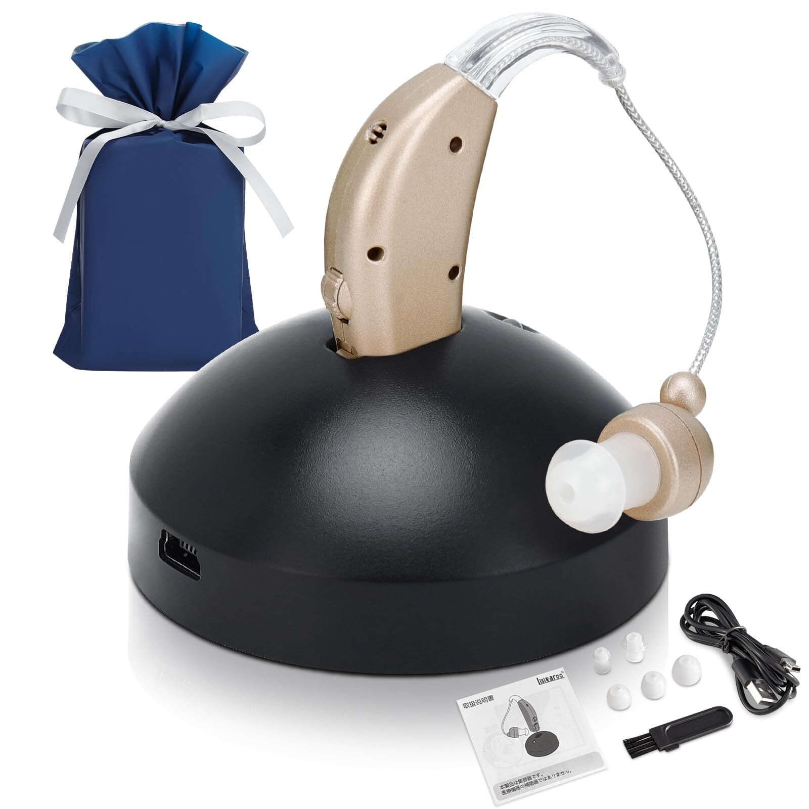 高齢者用音声集音器 充電式、イヤホックタイプ、両耳用、4 段階の音量調整、操作簡単、低ノイズ、音質が明瞭、感度が高い、小型軽量、使いやすい、お父さん・お母さんへの孝行プレゼント 母の日・父の日に イヤカップ付きの贈り物 (金色 + 丸い台座)