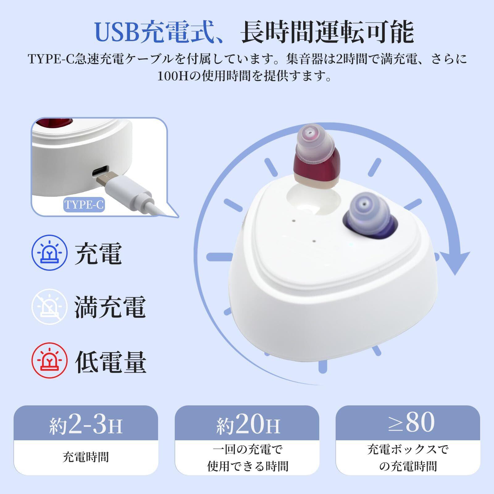 【Type-C急速充電&スマート充電システム】1回の充電で最大30時間連続使用可能!朝から夜まで一日中「聞こえ」をサポート。また、Type-C急速充電対応で、2~3時間でフル充電完了。充電ケース1回の満充電で、集音器を約5回充電可能です。LEDインジケーターで充電状態が一目で確認でき(充電中:ブルーランプ点灯、満電:ランプ消滅、低電量:赤いランプ点灯)、外出先でも電池切れの心配がありません。面倒な電池交換は不要で、高齢者の方にも簡単にお使いいただけます。
