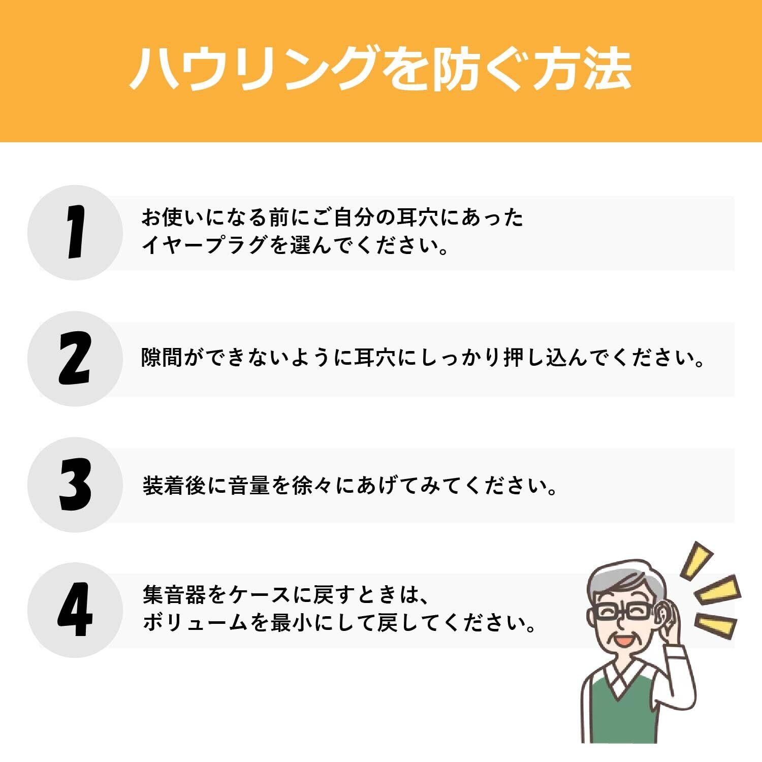【ハウリングについて】 ハウリングに関しましては耳穴のすきまがができることにより発生します。 耳穴にあったイヤープラグをお使いいただくことで防ぐことができます。 1,お使いになる前にご自分の耳穴にあったイヤープラグを選んでください。 2,隙間がでないように耳穴にしっかり押し込んでください。 3,装着する前に電源を切り音量を最小にしてください。 4,装着後に音量を徐々にあげてみてください。 5,集音器が初めての方はボリューム3がおすすめです。
