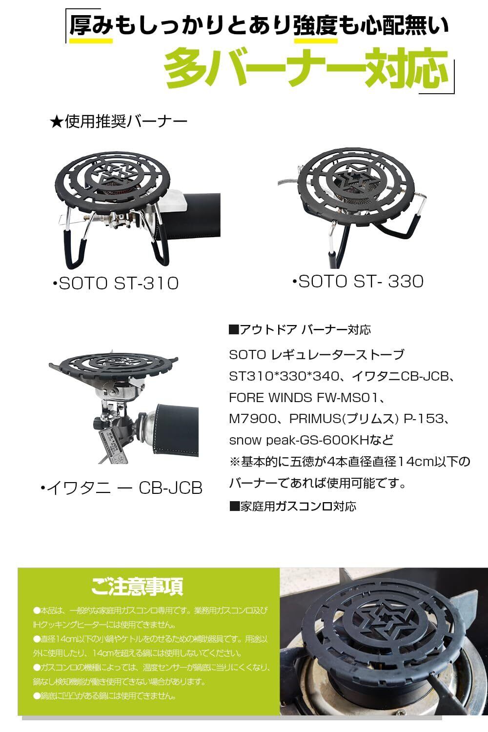 【多バーナー対応】使用推奨バーナー:SOTO レギュレーターストーブ ST310*330*340、イワタニCB-JCB、 FORE WINDS FW-MS01、M7900、PRIMUS(プリムス) P-153、snow peak-GS-600KHなど ※基本的に五徳が4本直径14cm以下のバーナーであれば使用可能です。