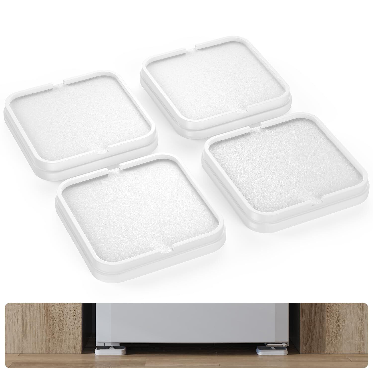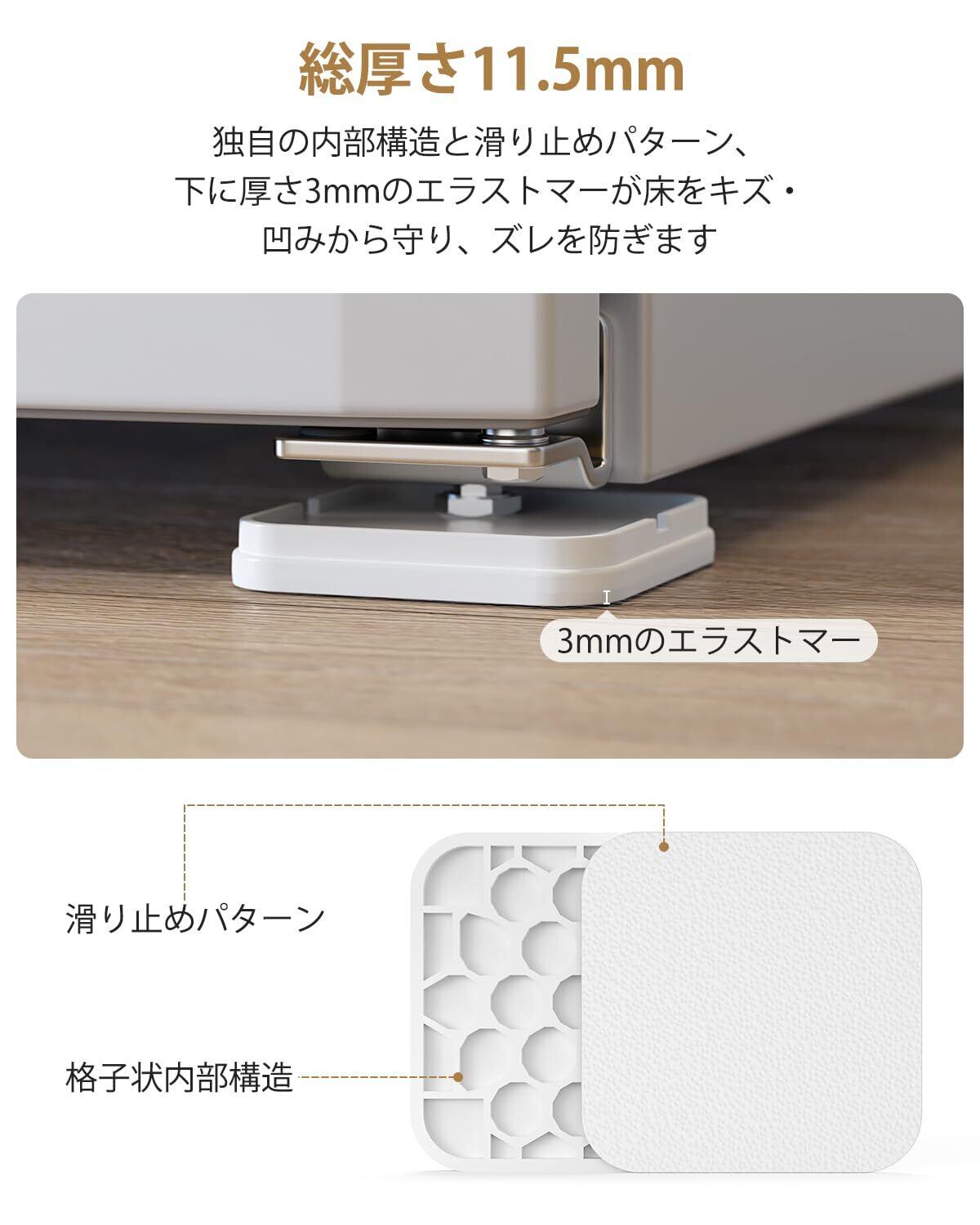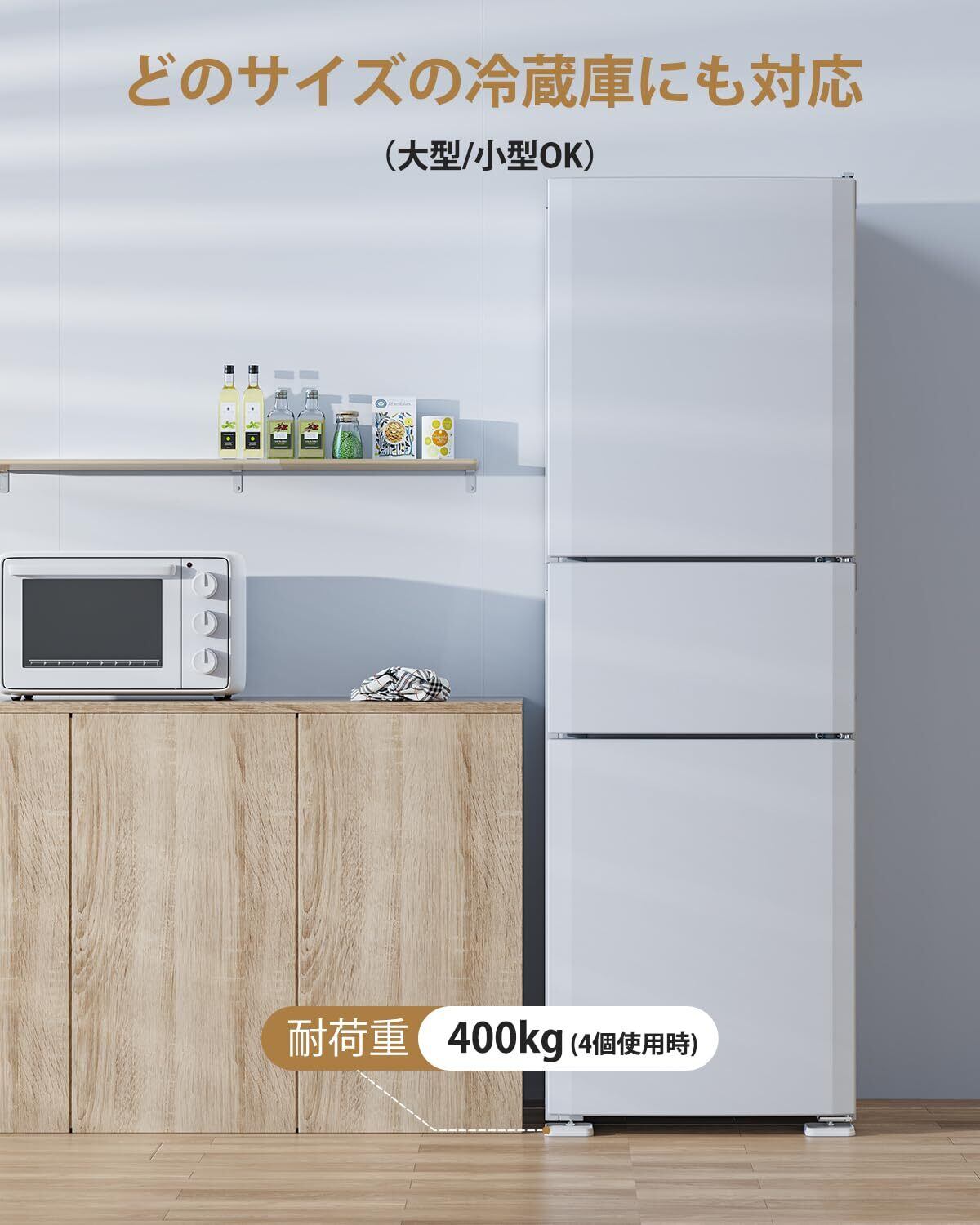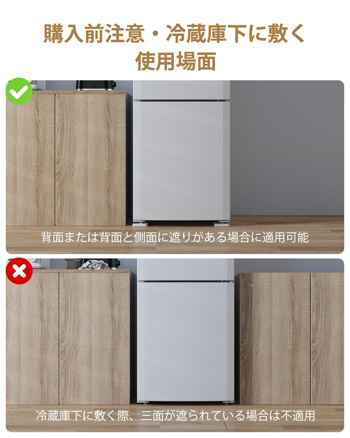 【購入前のご確認事項】 本製品は1個あたり95mm×95mm×高さ15mm(上げ高さ11.5mm)のコンパクトサイズで、多くの家電に対応しますが、特殊形状や極端なサイズの脚部には適合しない場合があります。また、冷蔵庫下に設置する際、三方向が完全に囲まれている場合は不適用となるため、背面または背面+側面が開放された環境での使用を推奨します。ご購入前に、設置箇所のサイズと周囲のスペースをご確認ください。