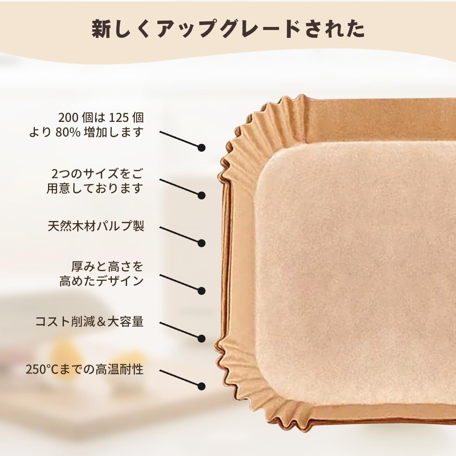 【複数のサイズからお選びいただけます】エアフライヤーペーパーは正方形と円形の2つの形状があり、内径は16cm/20cm、高さは4.5cmです。 1箱200枚入りなので、毎日の料理やお菓子作り、置き換えなど用途に合わせて幅広くお使いいただけます。 さらに、エアフライヤーペーパーは非常にコンパクトな箱に入っているので、キッチンであまりにも多くの保管スペースを占める必要がありません。