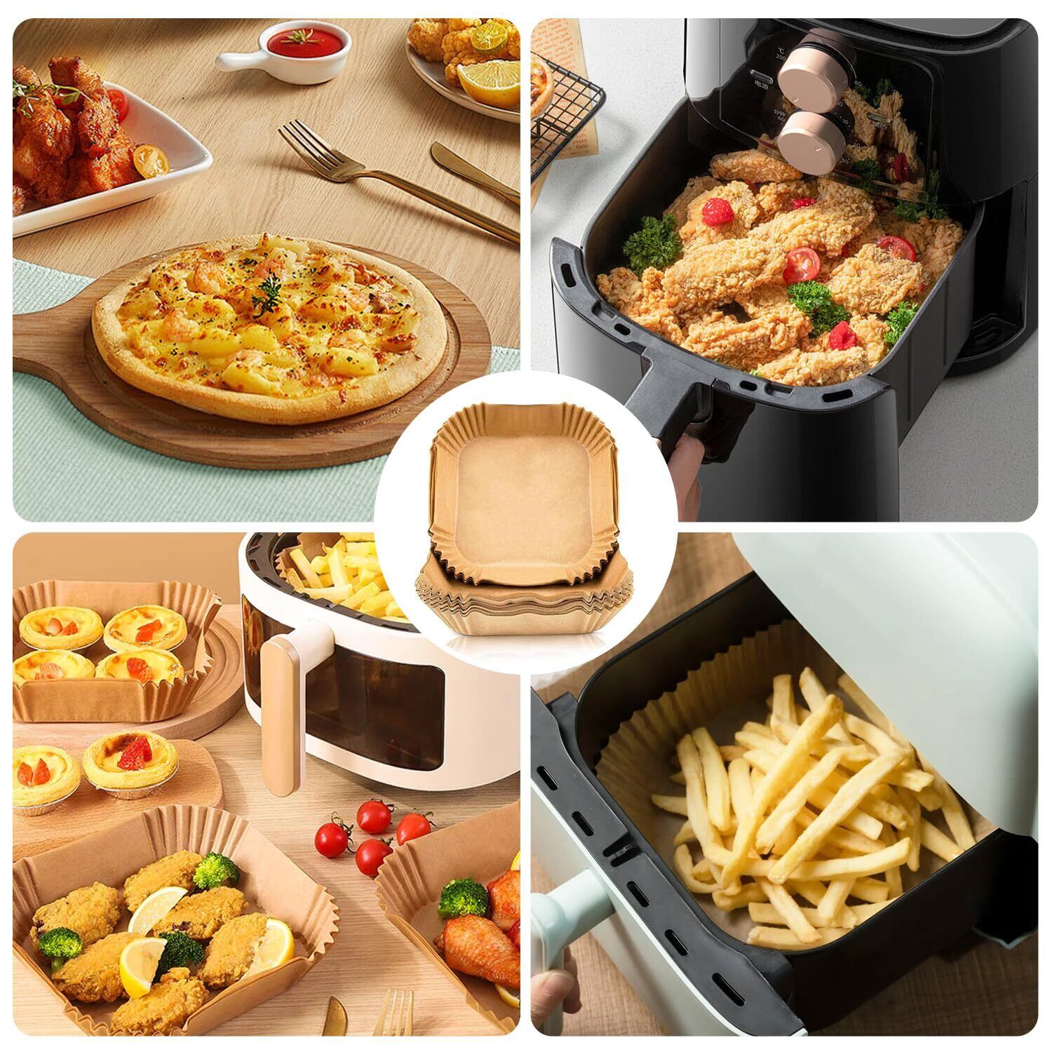 【幅広い用途】エアフライヤーペーパーはエアフライヤー、オーブン、蒸し器、電子レンジ、フライパンなどで使用できます。使い捨てエアフライヤーペーパーは完璧な食品保存容器です。フライドポテトや天ぷら、唐揚げなどの揚げ物、ケーキやビスケットなどのデザート、焼売などの蒸し物、焼き魚、バーベキューなどを作るのに便利です。料理にも使える!バーベキュー、誕生日パーティー、ホームベーキング、キャンプなどに最適です。