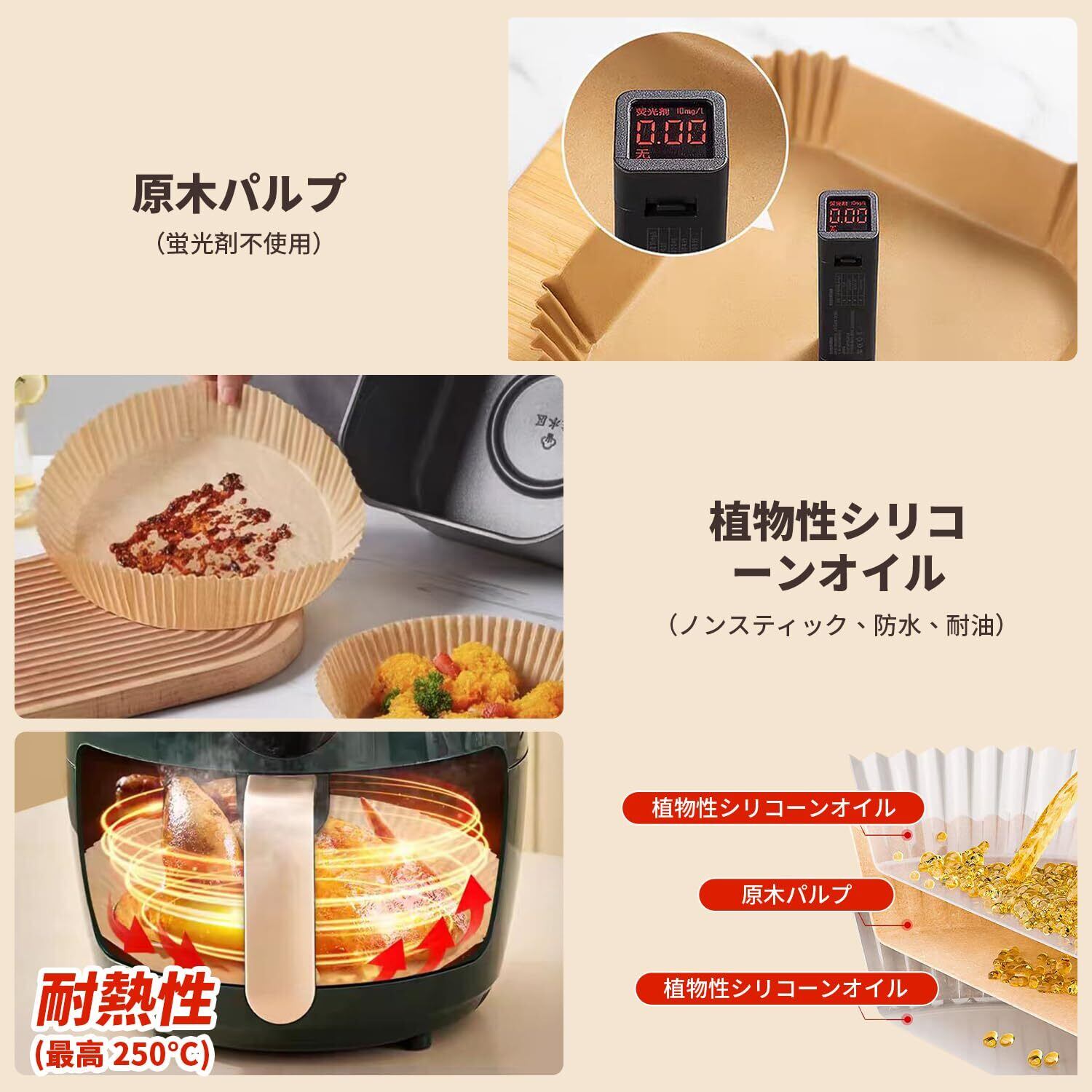 【安全で健康的な素材】エアフライヤーペーパーは食品用シリコンオイル紙を使用し、蛍光塗料や漂白剤が含まれていません。エアーフライヤーペーパーは防水性、耐油性、焦げ付き防止加工が施されており、フライドポテトをカリッと美味しく仕上げます。エアフライヤーペーパーはスープや油などの液体を浸透させず、汚れがつきにくいです。耐熱温度は230℃までなので、料理の味を損なうことなく、様々な料理に使えます。高密度設計のため、他のエアフライヤーペーパーに比べて破れにくいです。キッチンに欠かせない助っ人。