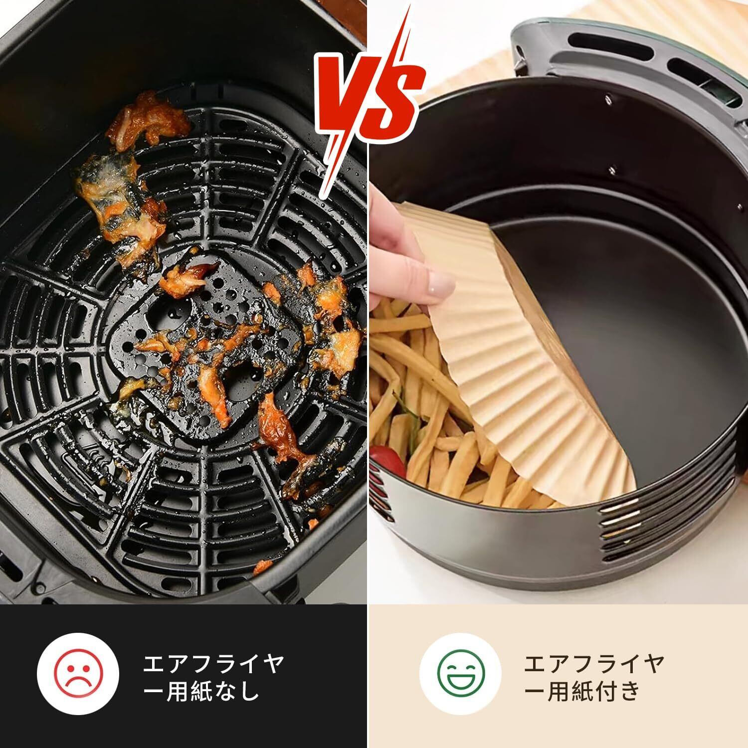 【注意事項と】予熱中はエアフライヤーペーパーを使用しないでください。食べ物にはエアフライヤーペーパーを使用してください。エアフライヤーペーパーの上に十分な量の食べ物を置きます(食べ物をペーパーの2/3まで埋めることをお勧めします)。フライヤーの熱風により紙が変形する場合があります。 空気が循環すると、エアフライヤーの紙が持ち上げられ、加熱コイルに接触する可能性があります。エアフライヤーペーパーを直火や炭火グリルの上で直接使用しないでください。エアフライヤーチップは食品に影響を与えます。実際の状況に応じて温度と時間を調整してください。 ●エアフライヤーペーパーについてご不明な点がございましたら、または破損または欠品がある場合は、当店にご連絡ください。お客様が満足できる解決策をします。