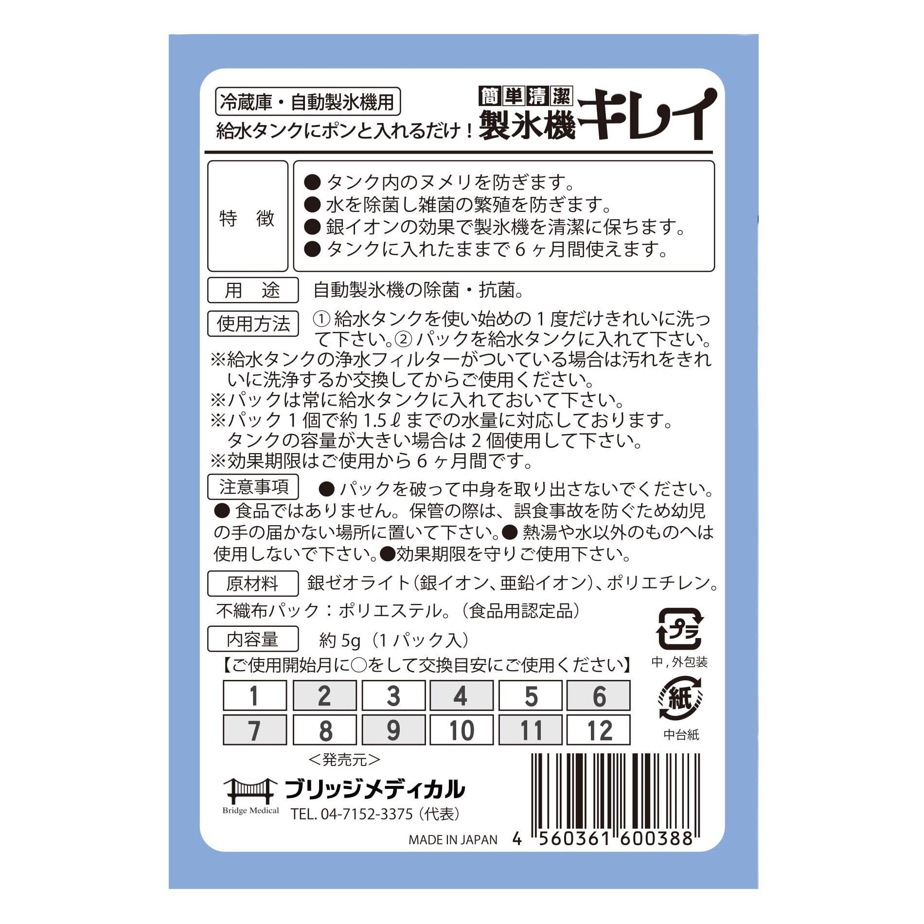 ●冷蔵庫の自動製氷機の水タンクへポンと入れるだけでタンク内のヌメリを防ぎます。 ●水を除菌し雑菌の繁殖を防ぎます。 ●銀イオンの効果で製氷機を清潔に保ちます。 ●使用開始より6ヶ月有効