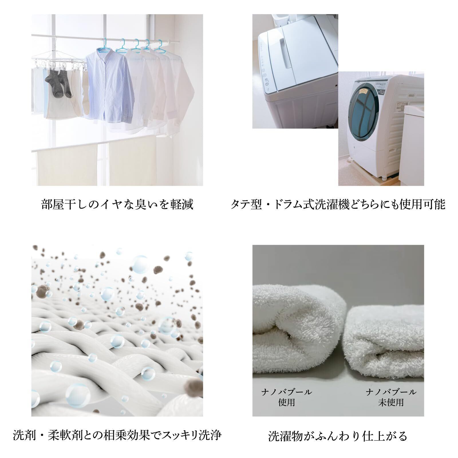 洗剤や柔軟剤との相乗効果により、優れた洗浄力と消臭力を発揮します 部屋干しによる生乾きのニオイ防止にも効果的! 安心の日本製