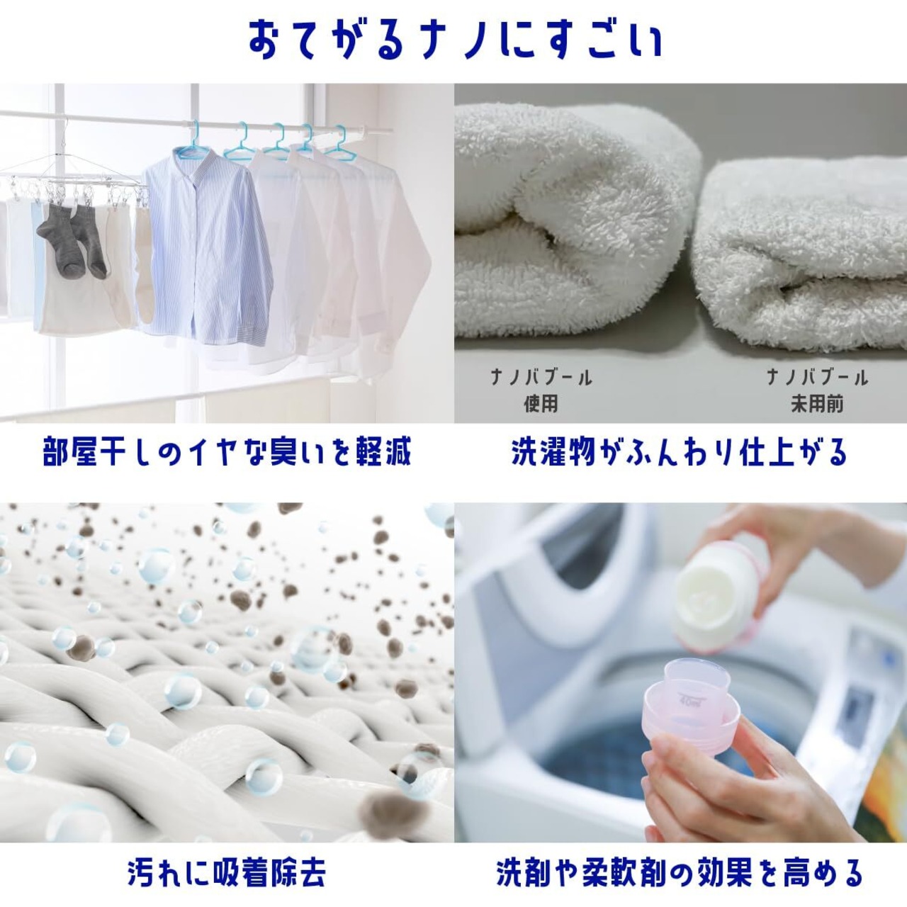 洗剤や柔軟剤との相乗効果により、優れた洗浄力と消臭力を発揮します 部屋干しによる生乾きのニオイ防止にも効果的