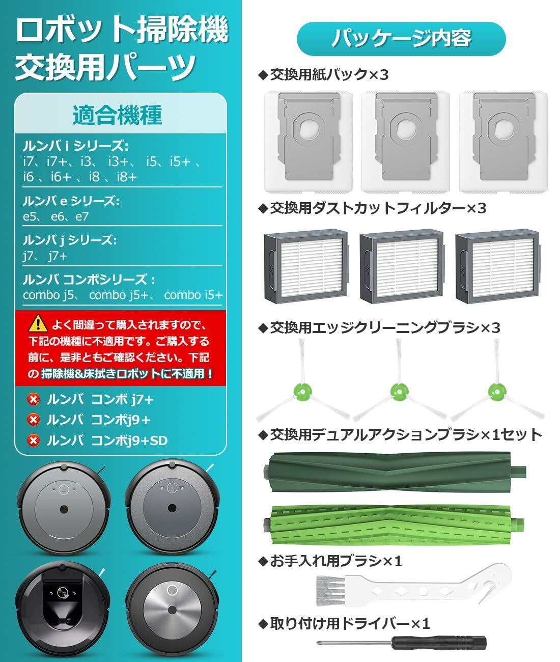 【パッケージ内容】 ルンバロボット掃除機 用 ダストフィルター ×3、紙パック×3、エッジクリーニングブラシ×3、エクストラクター×1セット、お手入れ用ブラシ×1個、日本語取扱説明書×1