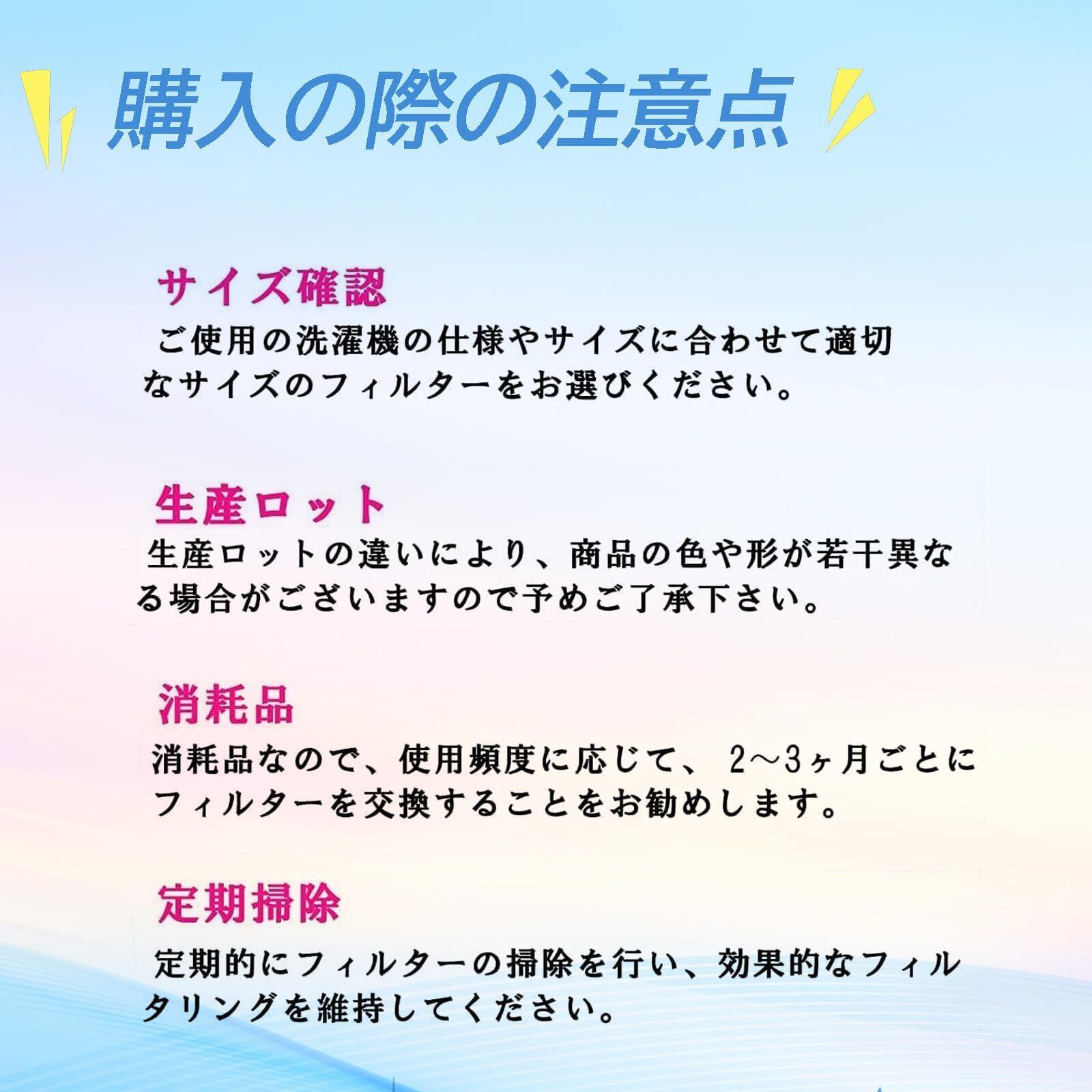【購入の際の注意点】 ● ご使用の洗濯機の仕様やサイズに合わせて適切なサイズのフィルターをお選びください。 ●生産ロットの違いにより、商品の色や形が若干異なる場合がございますので予めご了承下さい。それらはすべて使用可能です。 ●定期的にフィルターの掃除を行い、効果的なフィルタリングを維持してください。 アフターサービスについて: お客様の満足が最優先です。商品に不具合がある場合は、ご連絡いただければ迅速に対応させていただきます。 洗濯機用糸くずフィルターで、お家の洗濯をもっと快適で効果的にしましょう!今すぐカートに入れて、新しい洗濯体験をお楽しみください。