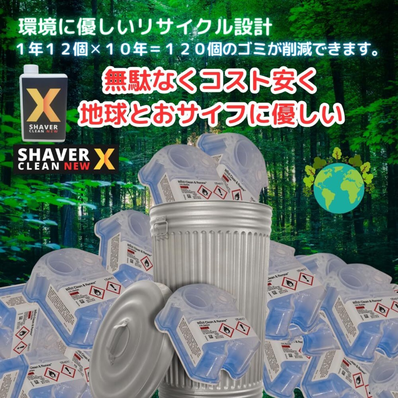 ブラウンシェーバー用の互換洗浄液「シェーバークリーンNew X」は、1,020ml入りで純正CCRカートリッジ6個分に相当し、1回あたり約11円のコストで使用できます。100%植物由来の蒸留アルコールを使用し、環境に優しい設計で、ブラウンシリーズ5、7、9に対応。簡単補充と洗浄後の乾燥にも配慮しています。