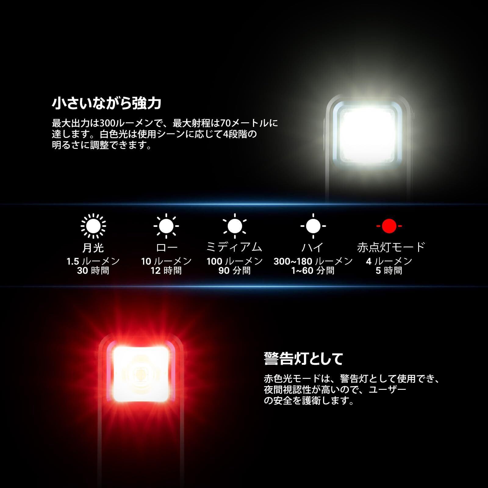 [ 二種類のLED光源&多目的] 白光&赤光二種類のLED光源を搭載しており、五つの常時点灯モード(Highモード、Mediumモード、Lowモード、Moonlightモード、赤点灯モード)があり、明るさは最大300ルーメンで、照射距離最大約70メートルに達します。小型懐中電灯としても使用でき、ランニング、散歩、ジョギング、点検、登山、キャンプなど様々なアウトドアシーンに大活躍します