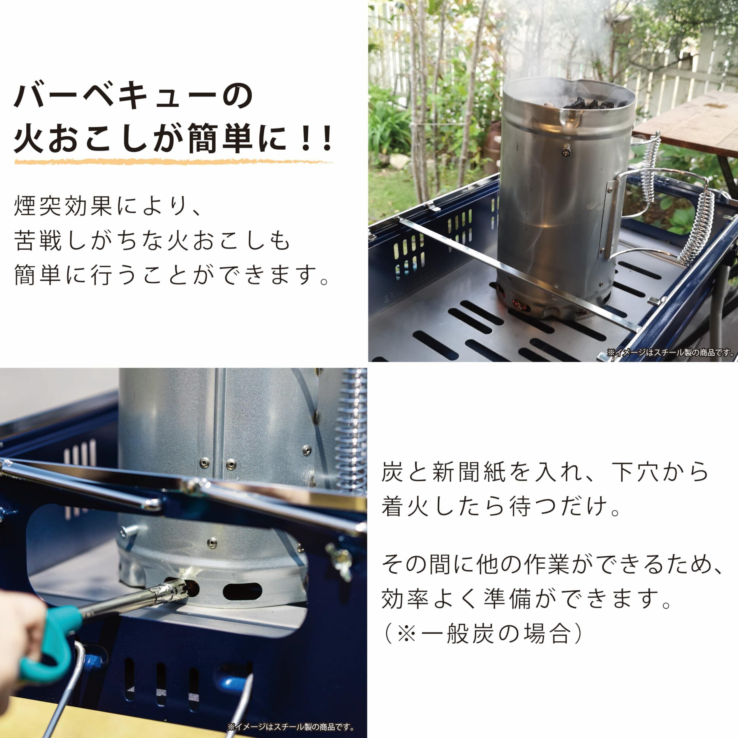 【煙突効果でカンタン火おこし】炭と新聞紙を入れ、下穴から着火したら後は待つだけでカンタンに火がおこせます。他の準備と並行して行えるのも嬉しいポイントです。