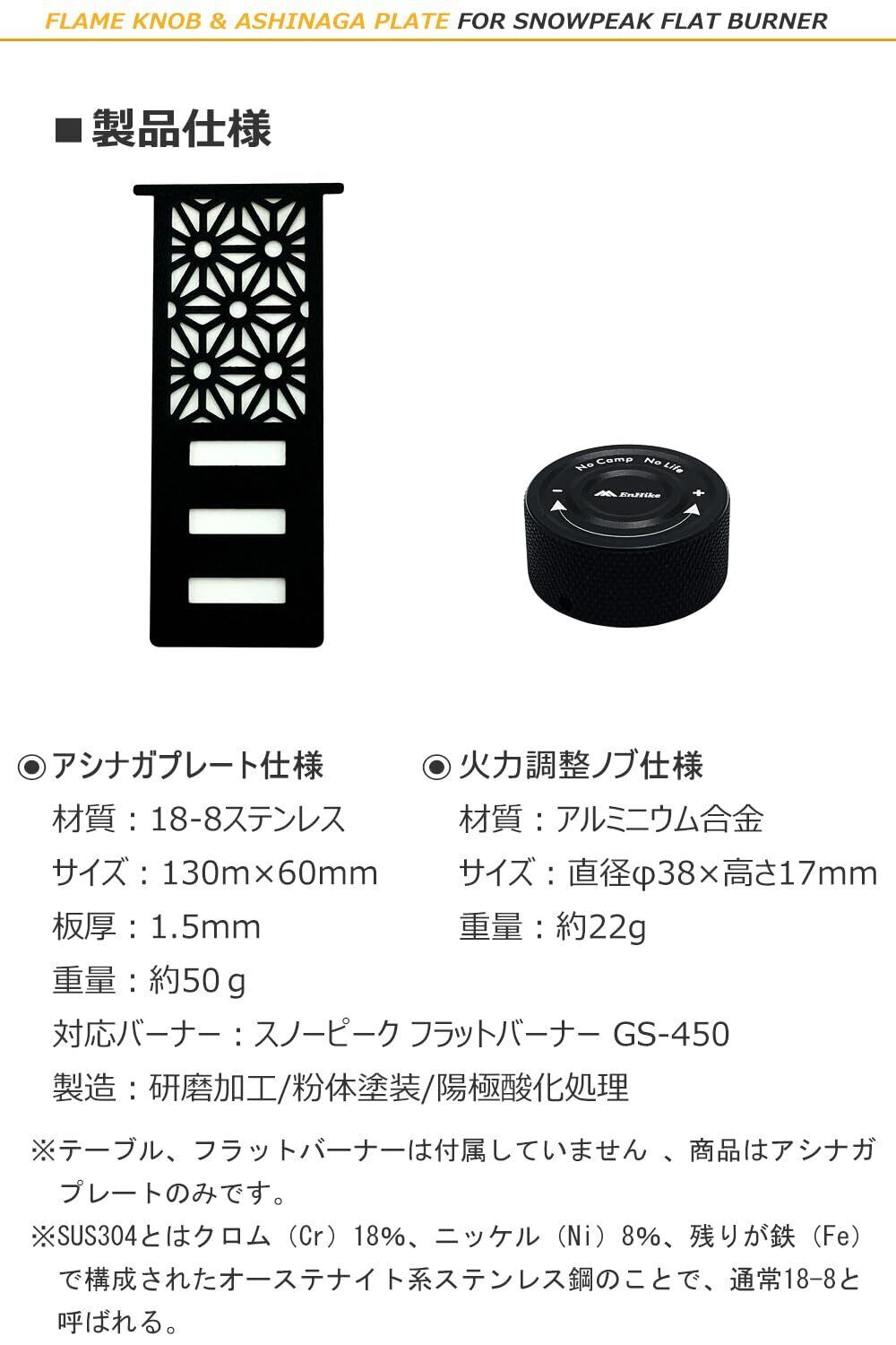 【商品仕様】火力調節ノブ:軽量なアルミニウム合金製で、重さはわずか22gです。サイズ:直径φ38×高さ17mm、重量:約22g。表面には陽極酸化処理が施されており、優れた耐久性を実現しています。長期間安心してご使用いただけます。アシナガプレート:耐熱性、耐久性に優れた18-8ステンレス素材を採用。サイズ:130m×60mm、板厚:1.5mm、重量:50g。対応バーナー:スノーピーク フラットバーナー GS-450。テーブル、フラットバーナーは付属していません 、商品はアシナガプレートのみです