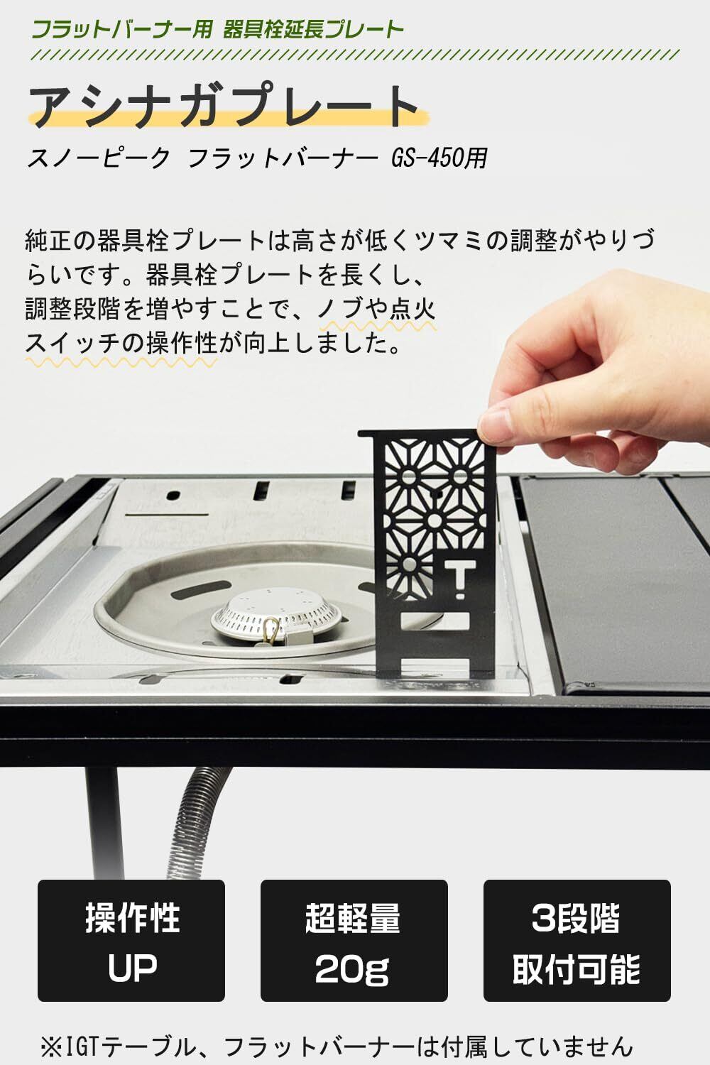 【操作性UP】スノーピーク フラットバーナーGS-450用アシナガプレート。純正の器具栓プレートは高さが低くツマミの調整がやりづらいです。器具栓プレートを延長することで、器具栓ホルダーの着脱が容易になるとともに、器具栓点火スイッチの使用やノブの調整が便利になります