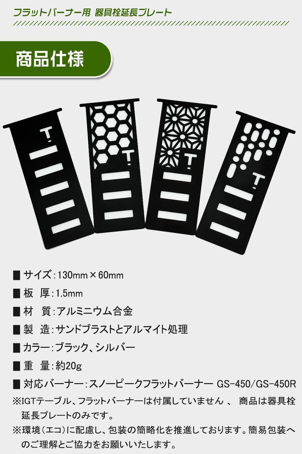 【商品仕様】サイズ:130×60mm、板厚:1.5mm、材質:アルミニウム合金、重量:約20g。対応バーナー:スノーピーク フラットバーナー GS-450/GS-450R。IGTテーブル、フラットバーナーは付属していません 、商品は器具栓延長プレートのみです。*環境(エコ)に配慮し、包装の簡略化を推進しております。簡易包装へのご理解とご協力をお願いいたします