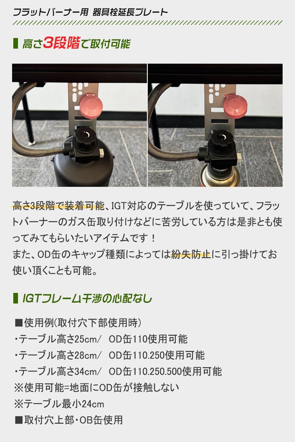 【IGTフレーム干渉の心配なし】標準で付属するプレートより長いので、よくある高さ40〜43センチぐらいのテーブルでの使用時にもOD缶の取り付け、取り外しがしやすく、使用時も膝に当たりにくく火力の調整がしやすくなります