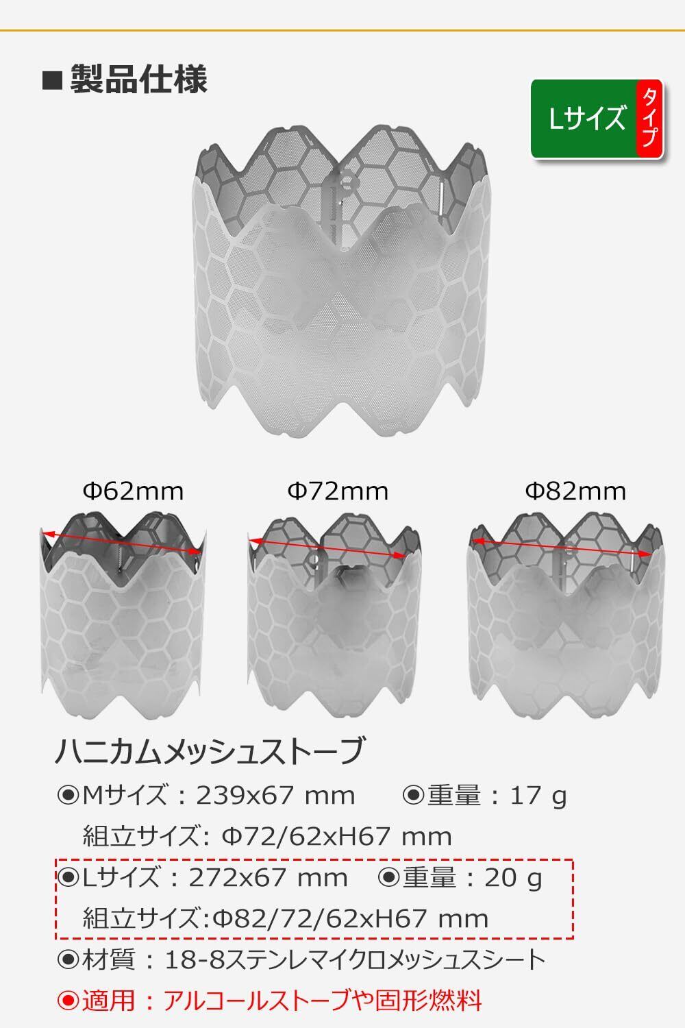 【拡張性あり!連結して大人数にも対応】複数のメッシュストーブを連結可能。広い加熱面が必要な場合や、大人数でのキャンプにも大活躍。【Mサイズ】1個使用時はΦ72mm×高さ67mmで、直径55mm以下のアルコールストーブ・固形燃料に最適。【Lサイズ】1個使用時はΦ82mm×高さ67mmで、一般的なサイズのアルコールストーブ・固形燃料に最適。2個連結すればΦ164mm×高さ67mmになり、大型バーナーにも対応します