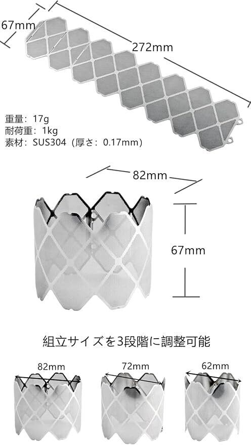 組立サイズを3段階に調整可能(直径:82㎜、72㎜、62㎜)なので様々なクッカーやストーブと合わせることができます。
