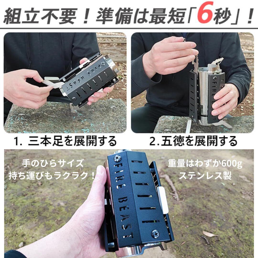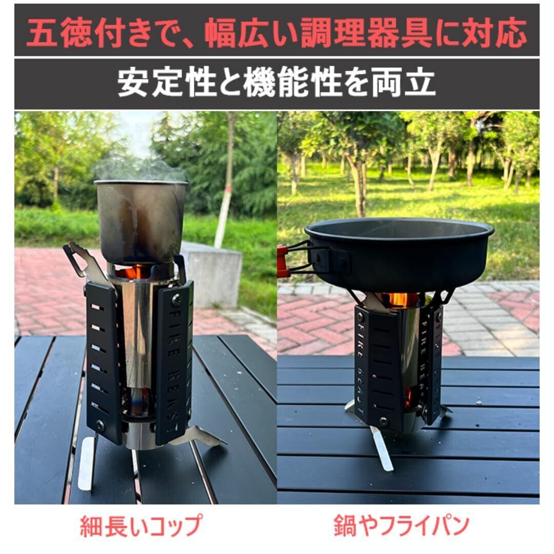 【安定性と耐久性を両立】高温にも強いステンレスを採用、どんな環境でも頼れるタフな作りに。付属の五徳は幅広い調理器具に対応し、三本の固定脚で抜群の安定性を実現。風が強い場所や不安定な地面でも安心して使用できます。