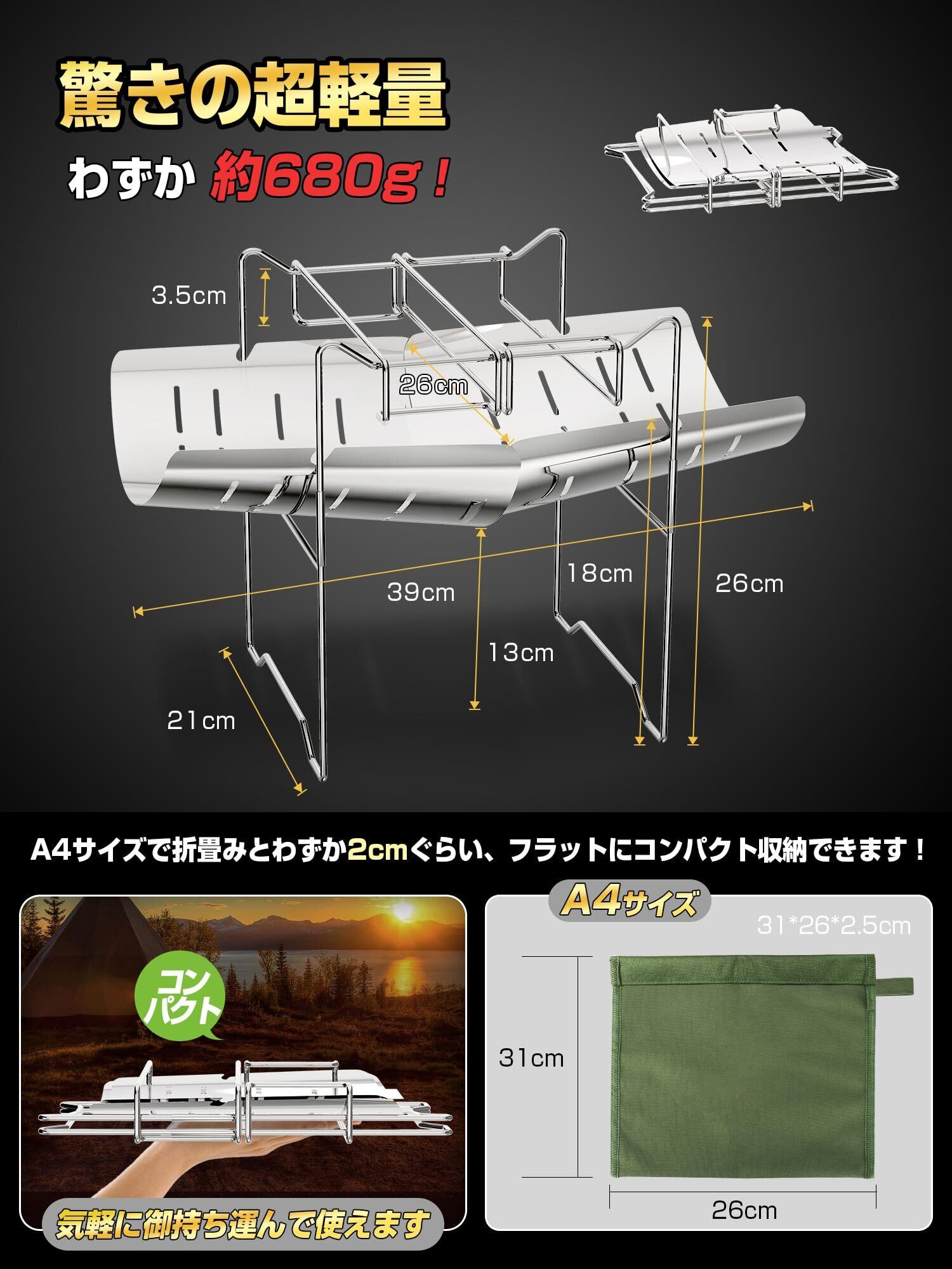 【A4の収納サイズ・軽量でコンパクト】当社のソロ用焚火台はただ680gで、分解して薄くでき、A4サイズに折り畳んで、フラットな形で収納でき、携行性に優れています。また、楽に持ち運べる収納ケースが付いているので、キャンプだけでなく、登山やハイキングなど、さまざまなアクティビティと一緒に焚き火を楽しめます。【安心な品質管理・一年間安心付き】当社の製品は品質体制とサポート体制も完備しております。万が一初期不良がございましたら、一年間があり、どうかお気軽にお問い合わせください。