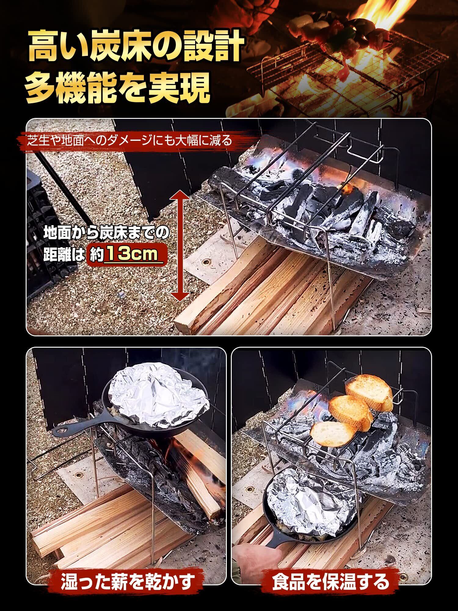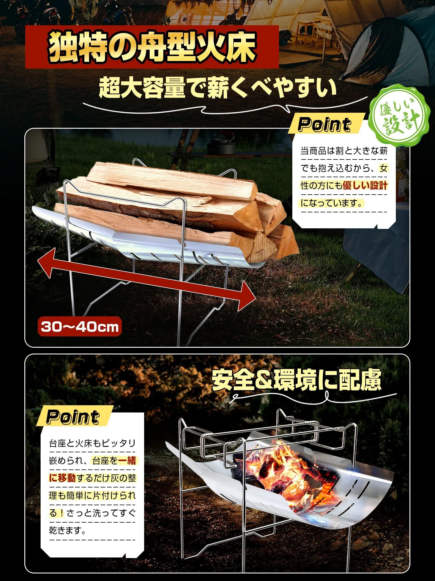 【高い炭床の設計・多機能を実現】焚き火台は焚き火の熱が直接伝わらないように地面から炭床までの距離は約13cmと余裕があるので、芝生や地面へのダメージにも大幅に減っています。更に、空間もかなり広く、薪を乾かしながら、オーブンとしてピザなども作れます。【一体式台座・安定性抜群】組み立て式台座より、クロス型加工された台座は支柱の角度などの細部までこだわって、丈夫なステンレス素材を採用して安定性がより向上し、組み立てや撤収も簡単です。焚き火初心者でも使いやすく設計されており、簡単に設営できます!台座と火床もピッタリ嵌められ、台座を一緒に移動するだけ灰の整理も簡単に片付けます。