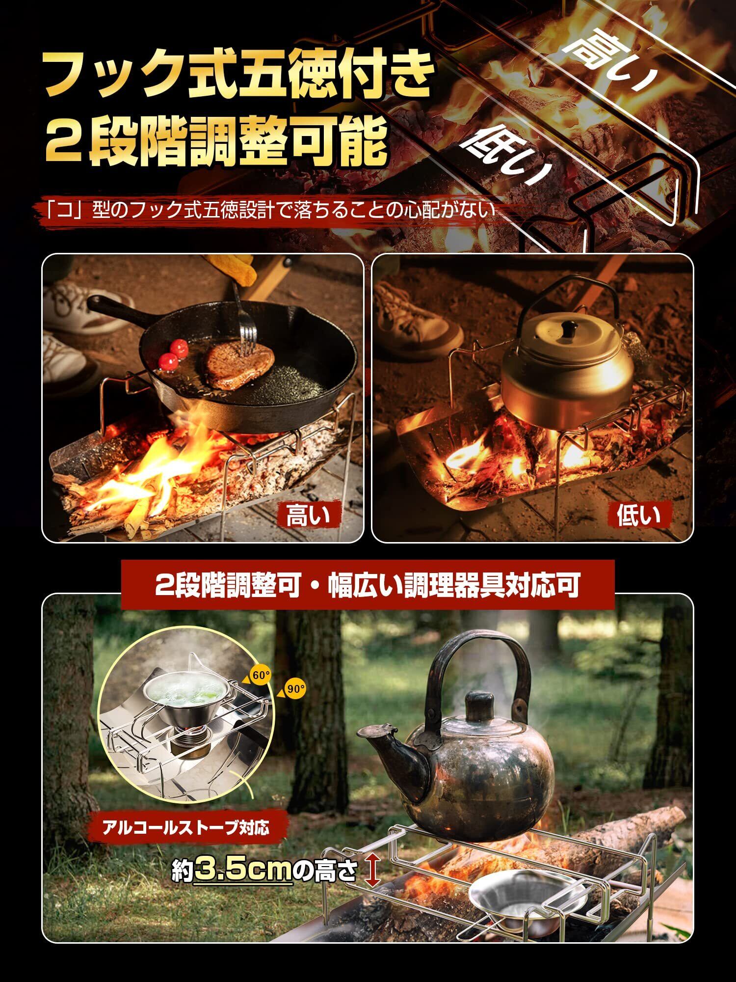 ■【高さ調整が可能!】フック式五徳を使用することで、高さを自由に調整できるため、料理の際の火力管理も楽々。様々な調理器具と組み合わせて、幅広い料理に挑戦できます。